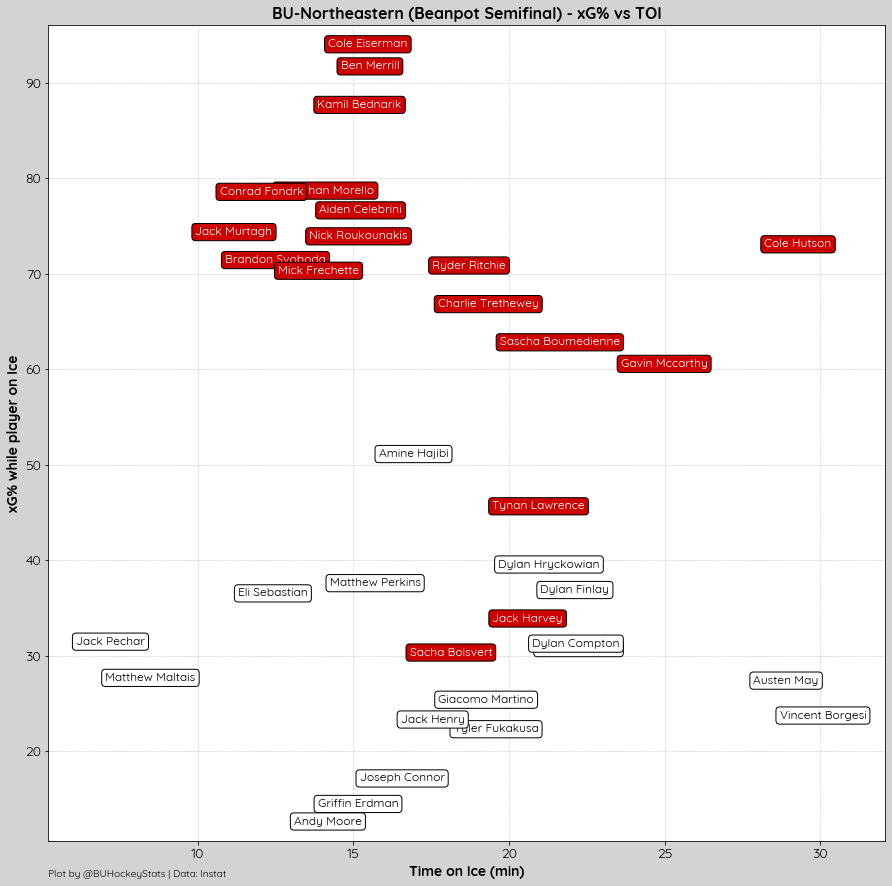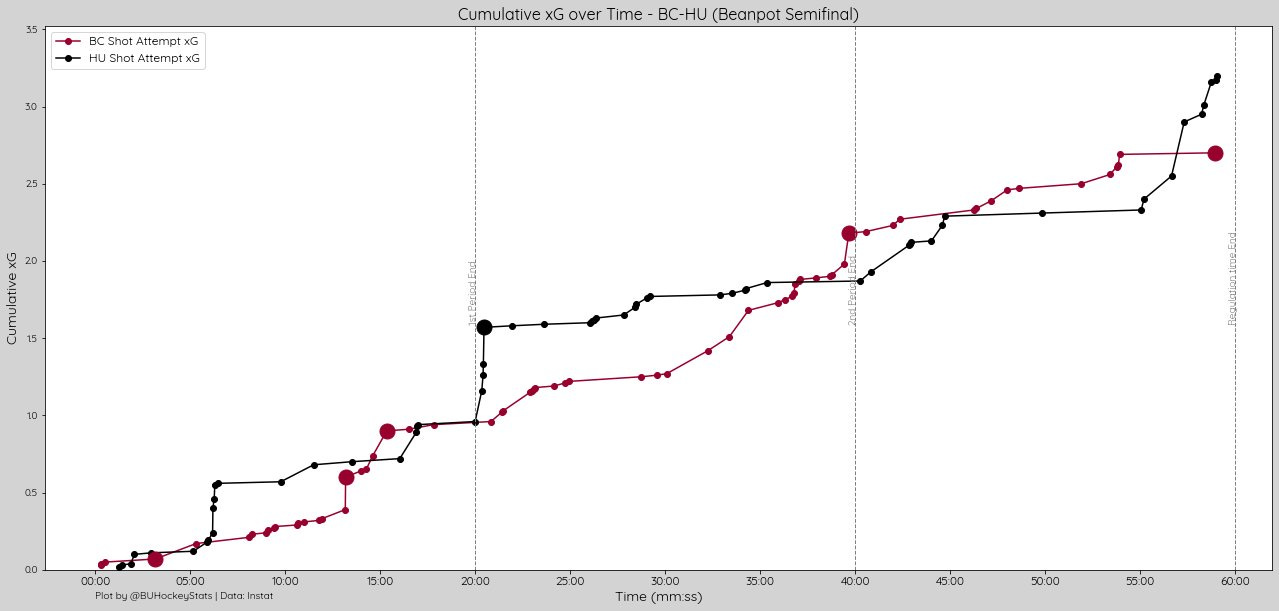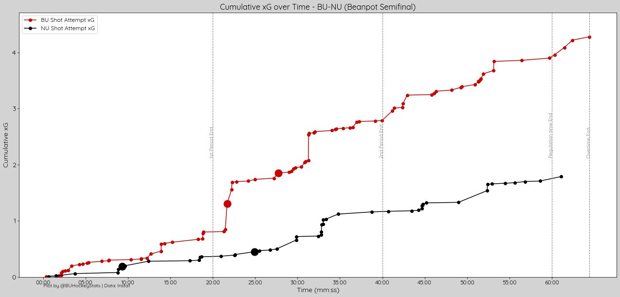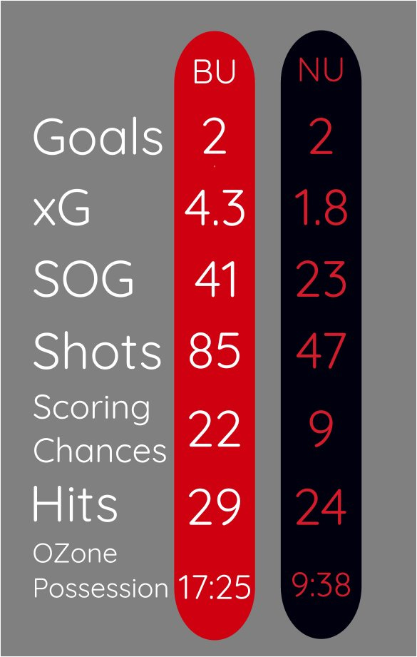 BU recorded 3 High Danger shots (1.17 xG) one of which resulted in Morello’s goal (.46 xG), one was saved (.46 xG), and one missed the net (.25 xG). NU recorded just 1 (.21 xG) which was saved.