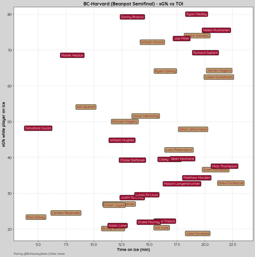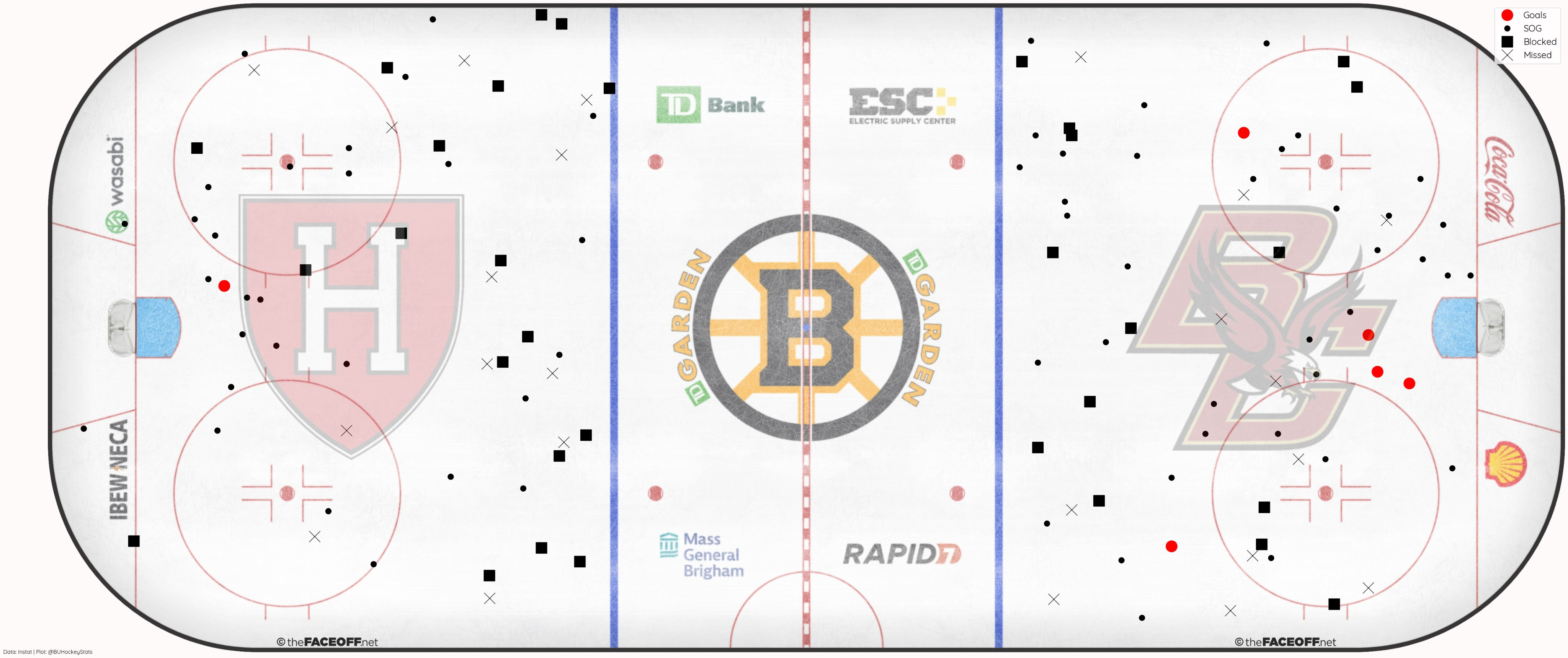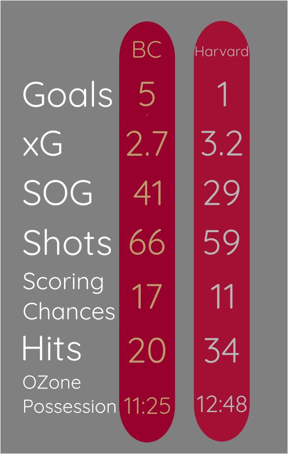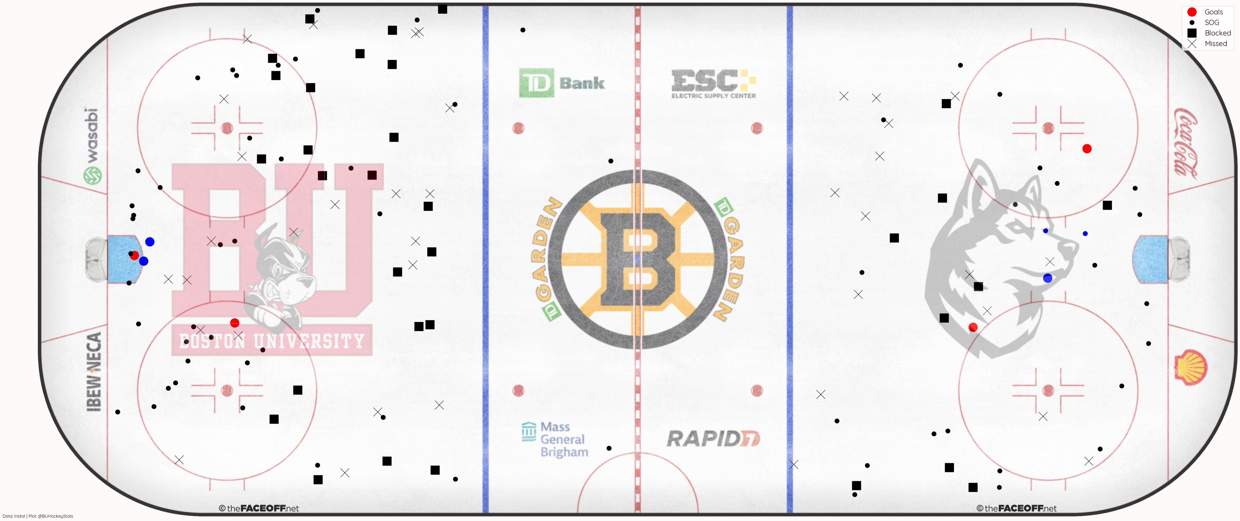 The Terriers won both OZone Faceoffs (56%-46%) and DZone Faceoff (54%-44%) while teams were even in NZone Faceoffs (50%-50%). BU held possession at EV 59% to 41%.