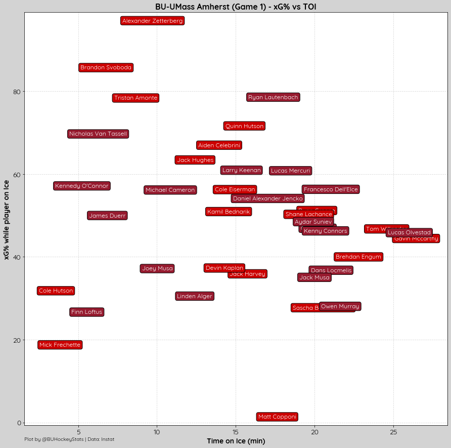 Matt Copponi recorded a team low 1.36% xG%, with BU recording a miniscule .01 xG when he was on the ice. On the other end of the spectrum, Alex Zetterberg record a team high 97.05% xG% in his 9:43 of ice time.