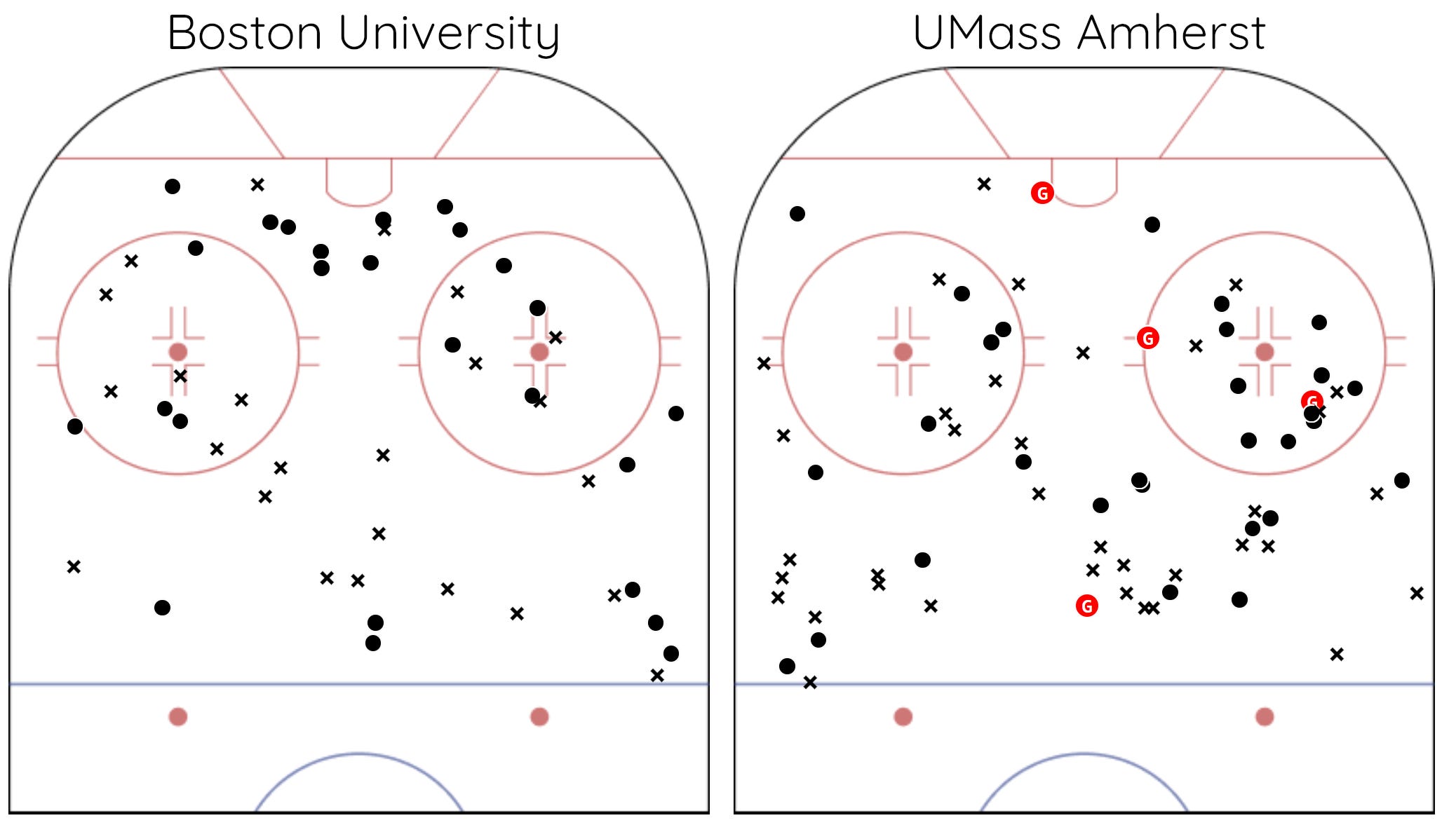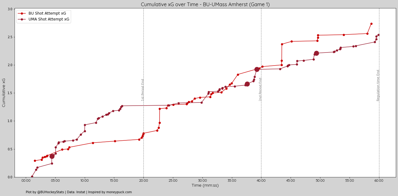 In terms of cumulative xG BU got out to an early lead, lost the after the Minutemen’s first goal who proceeded to record a flurry of shot attempts in the last 10 minutes of the first period. In the second, things were a bit more back and forth, though UMA was able to capitalize on a major power play late in the second. As the third period began, BU got the xG lead for good, but was unable to turn it into goals.