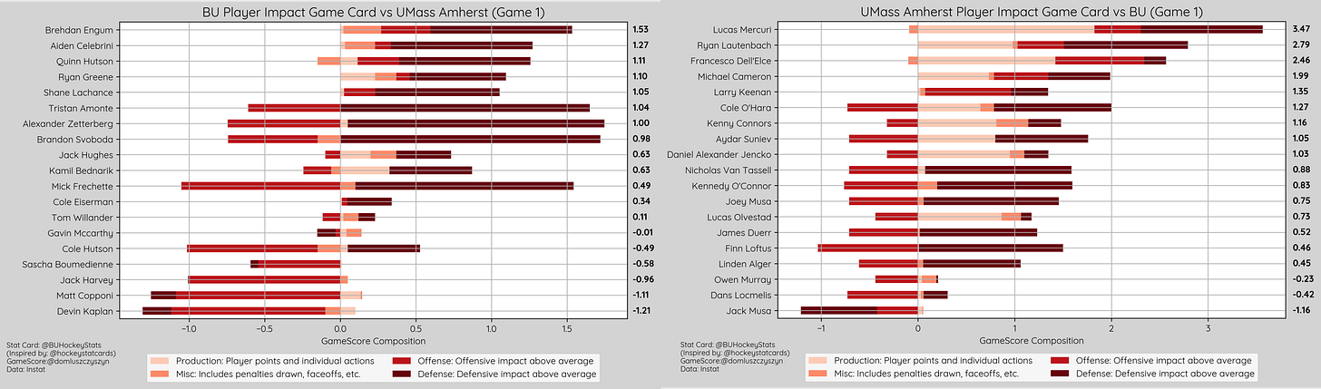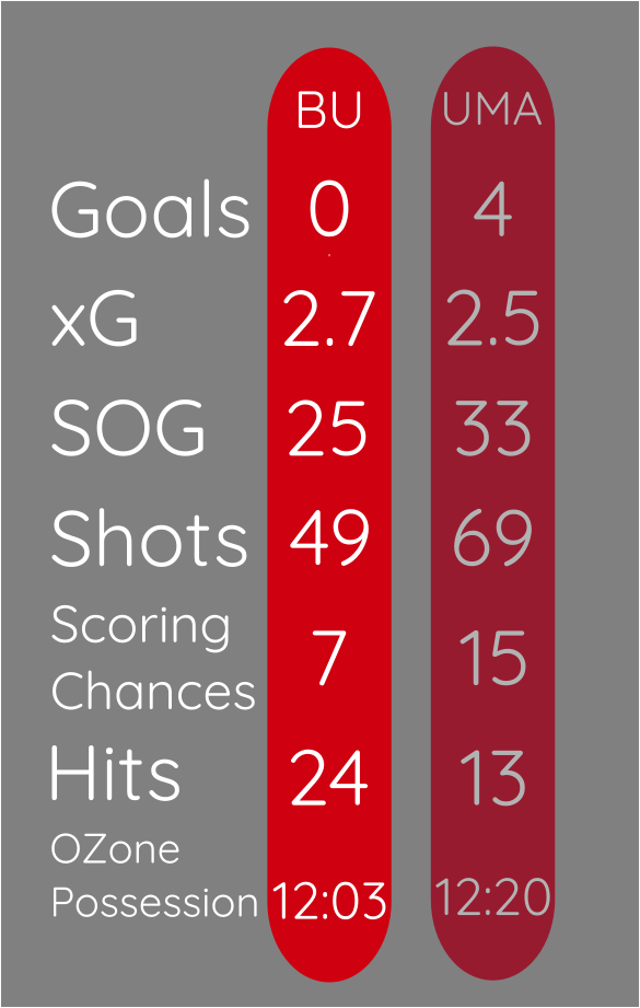 Despite the goals, shots on goal, shot attempts, and scoring chance gaps, BU actually held a slight xG edge over UMA (+.2). At even strength, xG was even tighter, with BU edging UMA 1.67-1.6. The Terriers also held a slight edge in puck battles (52%-48%) and OZone (56%-38%) and DZone Faceoffs (63%-44%).