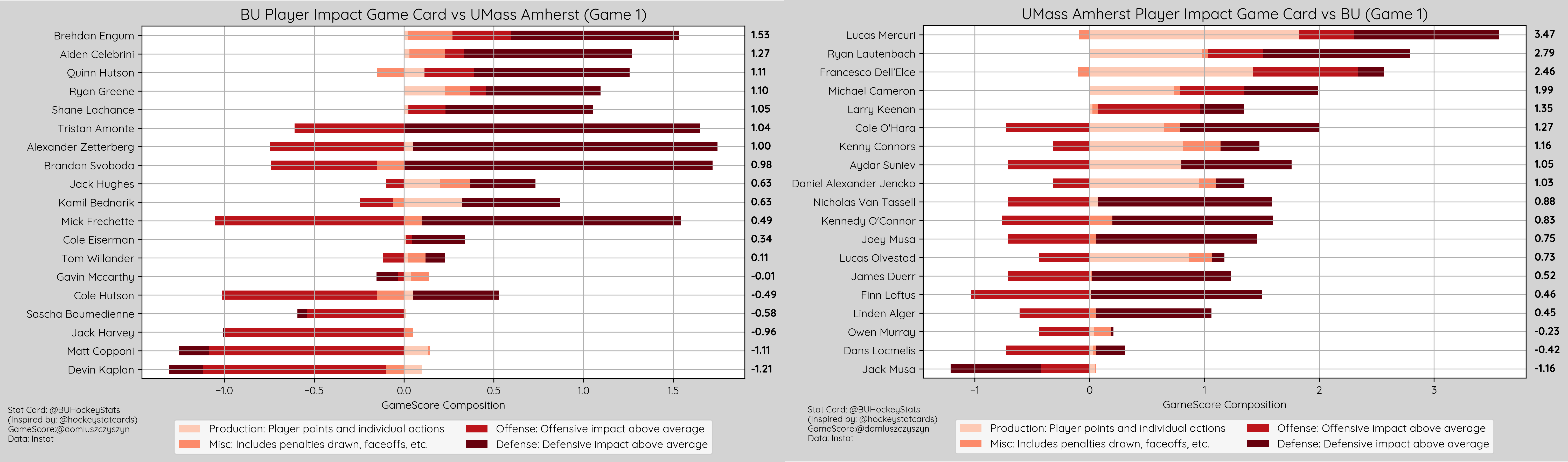 BU recorded 3 high danger shots (.83 xG) including 2 shots on goal. The Terriers also limited the Minutemen to 0 high danger shots, with 38 of UMA’s 44 unblocked shot attempts low danger shots.