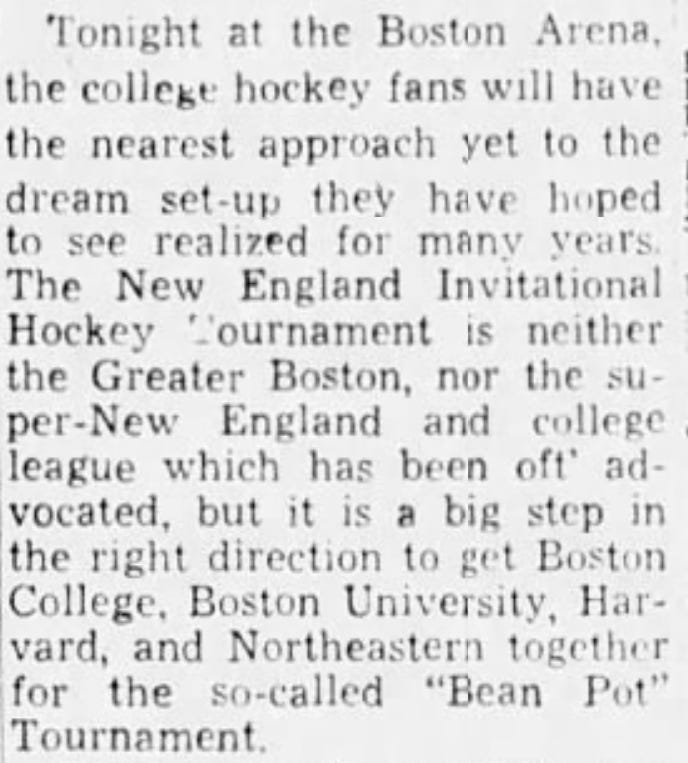 It would not become its traditional self until the 1958 edition, when fittingly, BU won its first Beanpot title after beating BC 5-4 on February 3rd, and Northeastern 9-3 in the final on February 10th.