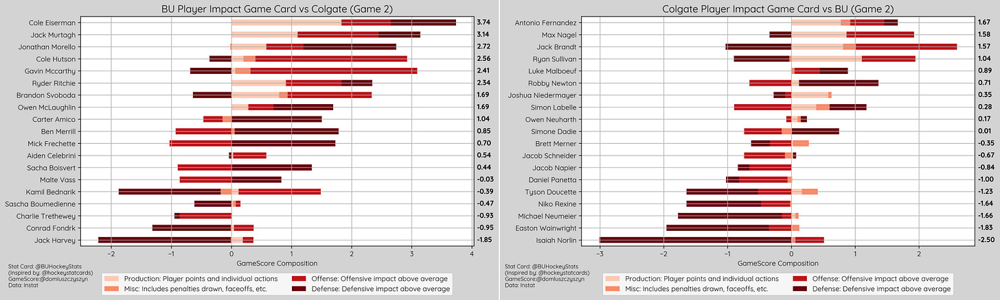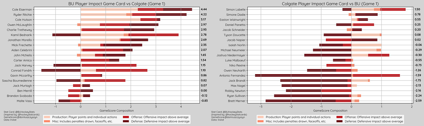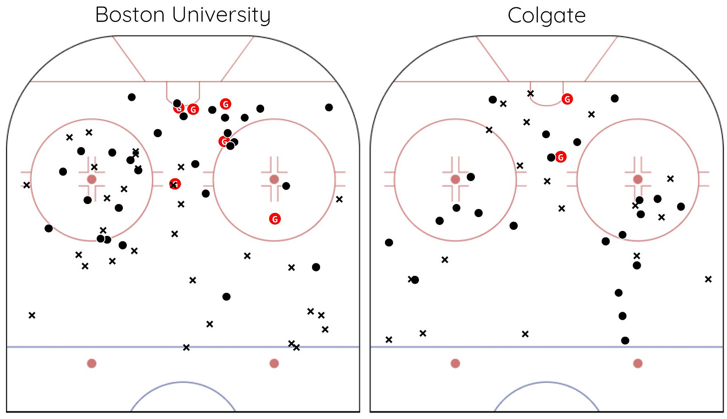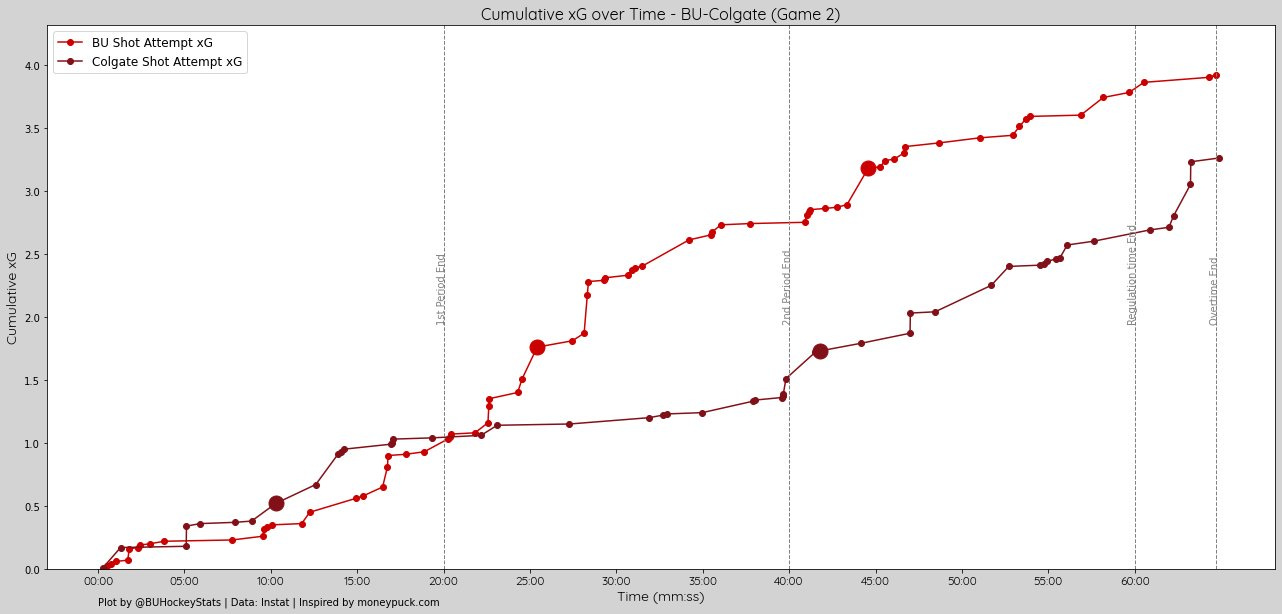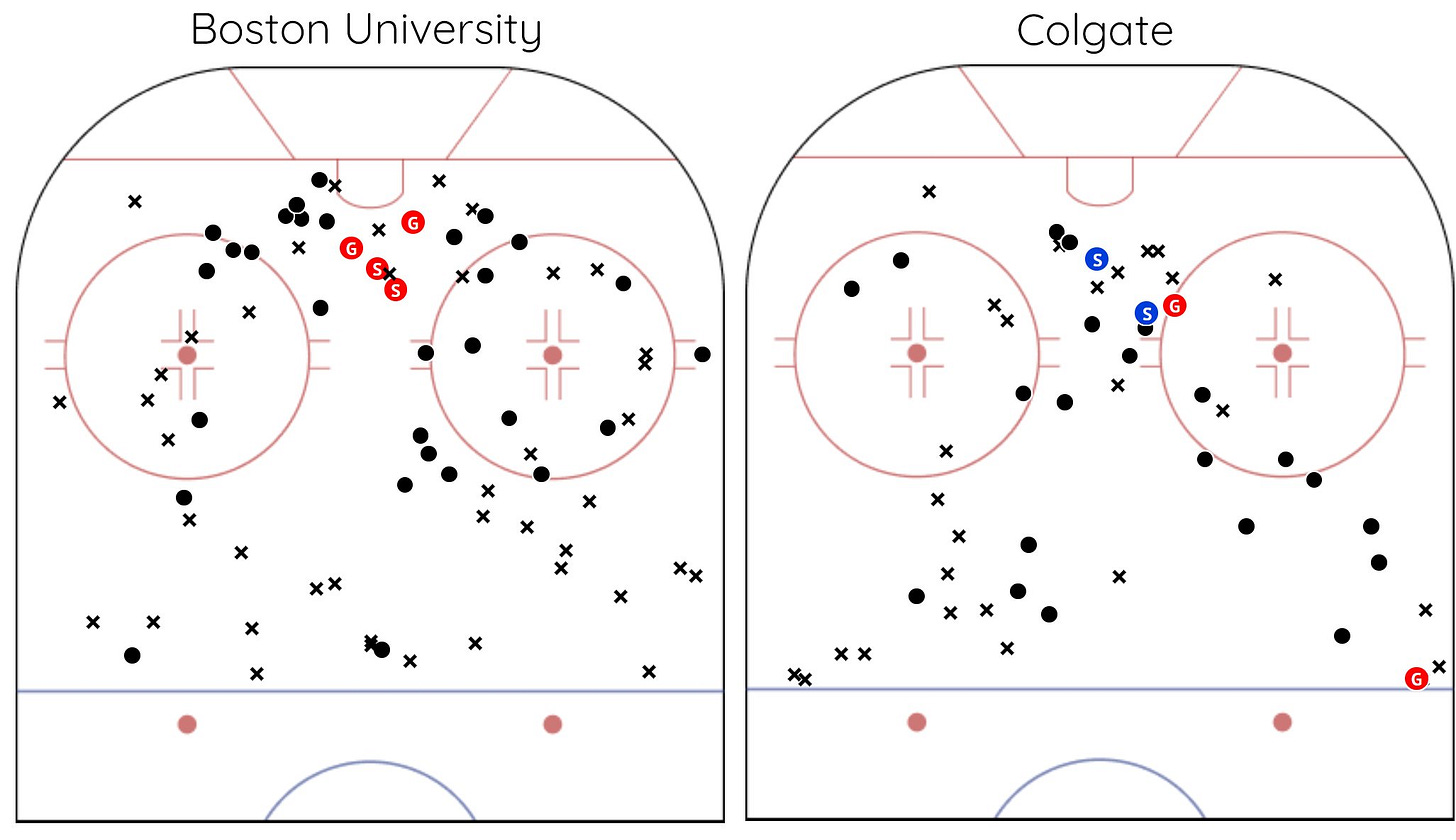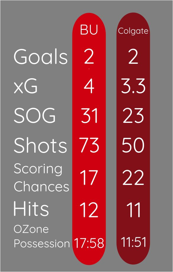 Per Period xG: 1st (0.93-1.04, Colgate), 2nd (1.81-0.47, BU), 3rd (1.04-1.09, Colgate), OT (0.14-0.66, Colgate)