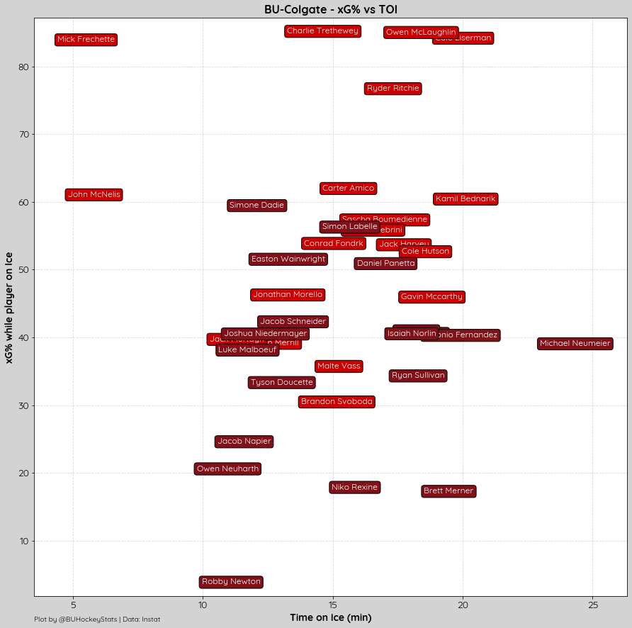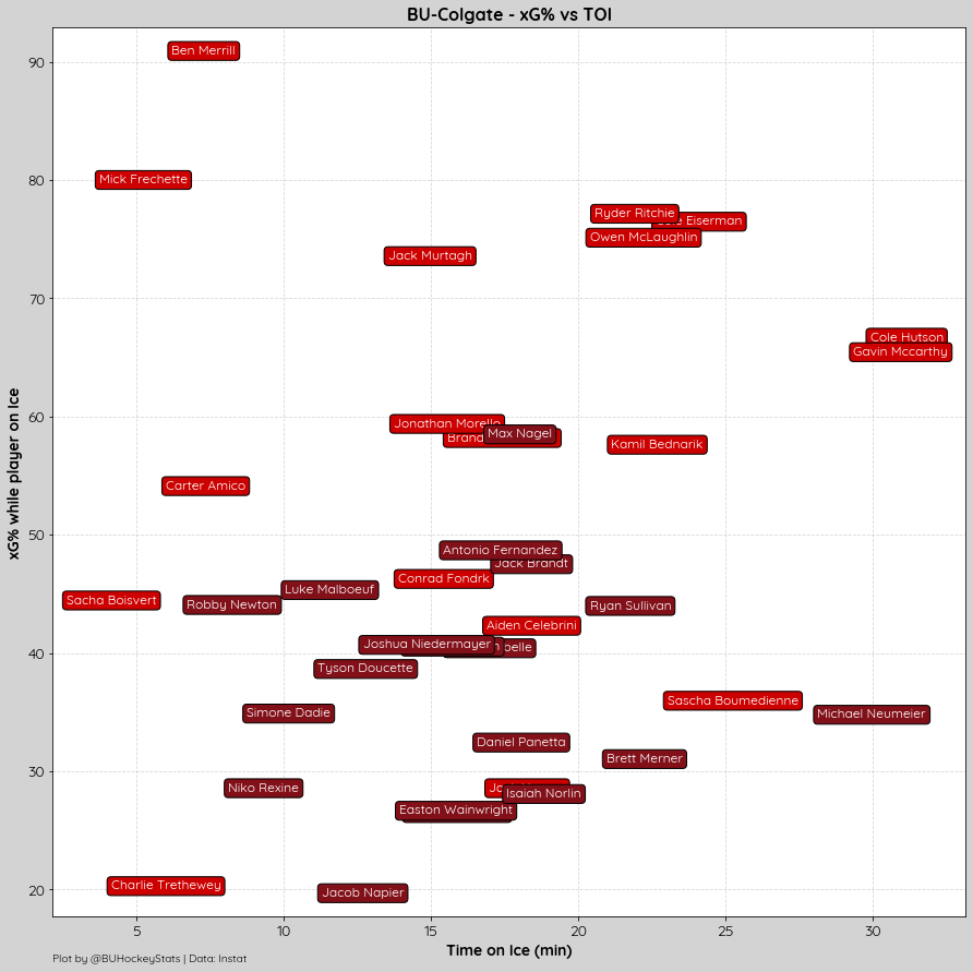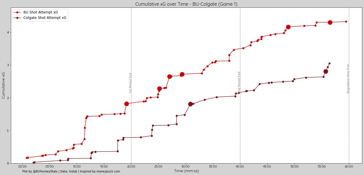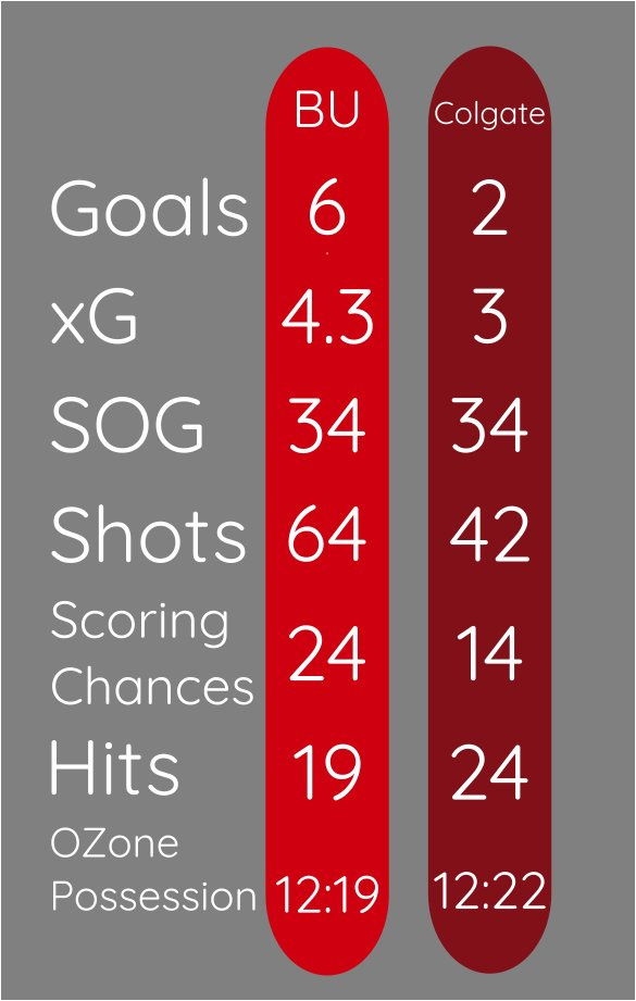 Per Period xG: 1st (1.82-0.78, BU), 2nd (1.65-1.37, BU), 3rd (0.86-0.90, Colgate)