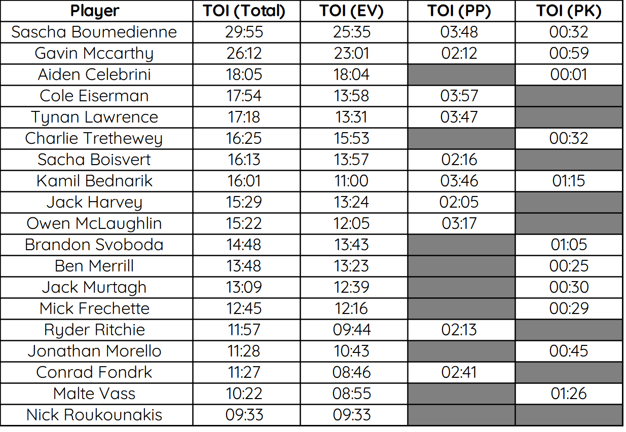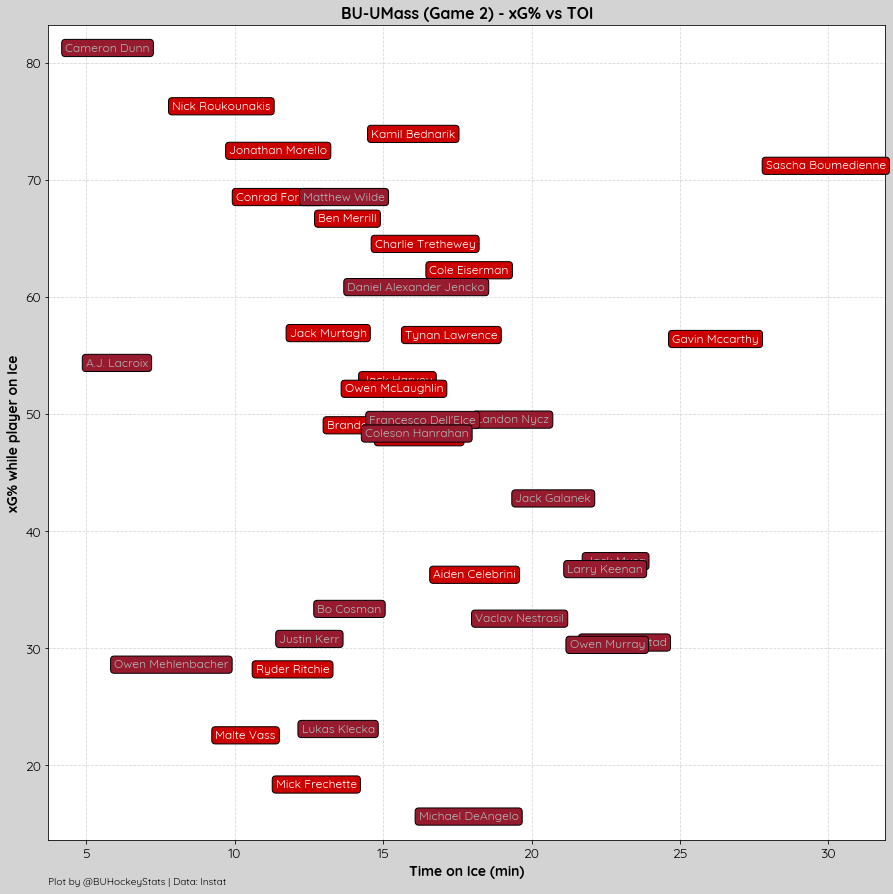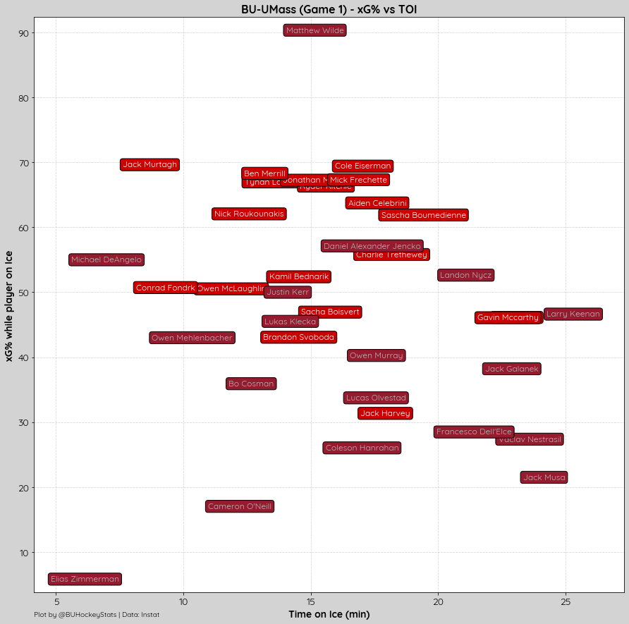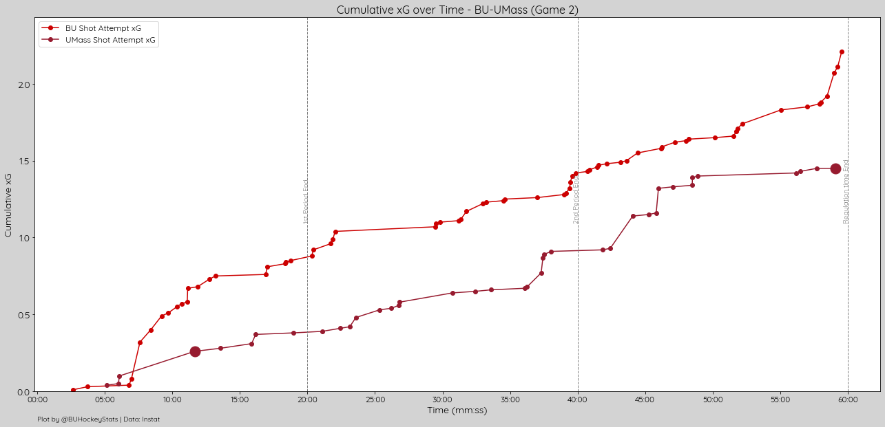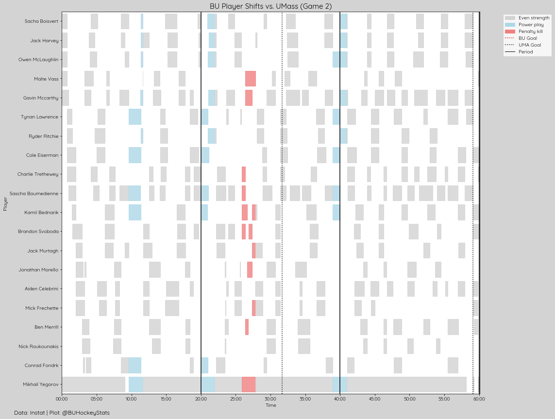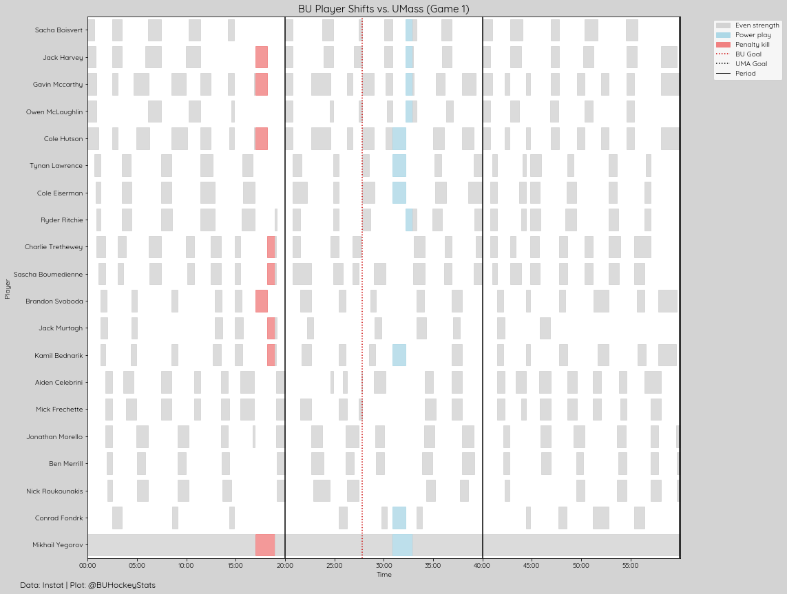 BU recorded just 1 High Danger shot (.25 xG) which was Jack Harvey’s goal, compared to UMA’s 2 (.40 xG) one was saved by Yegorov, one missed the net