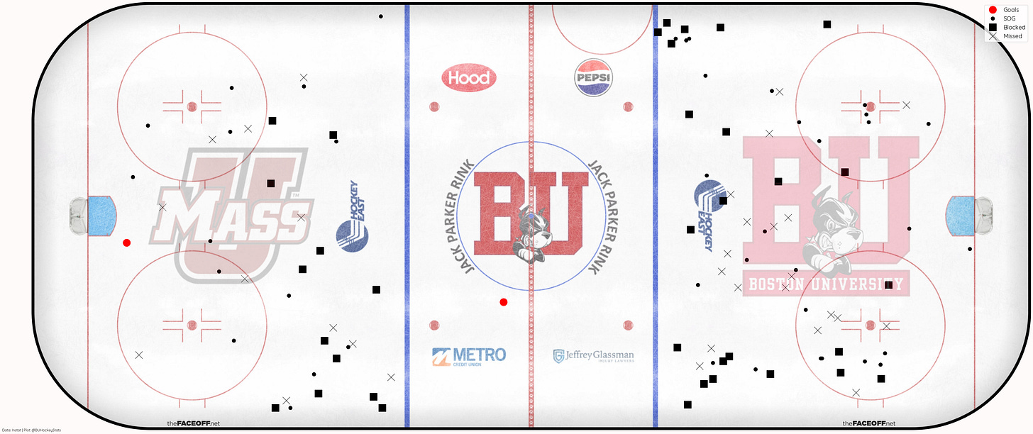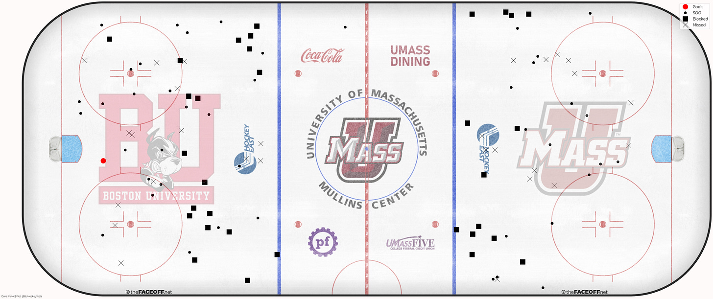 Both teams recorded 1 High Danger Shot, BU’s was saved, UMA’s missed the net.