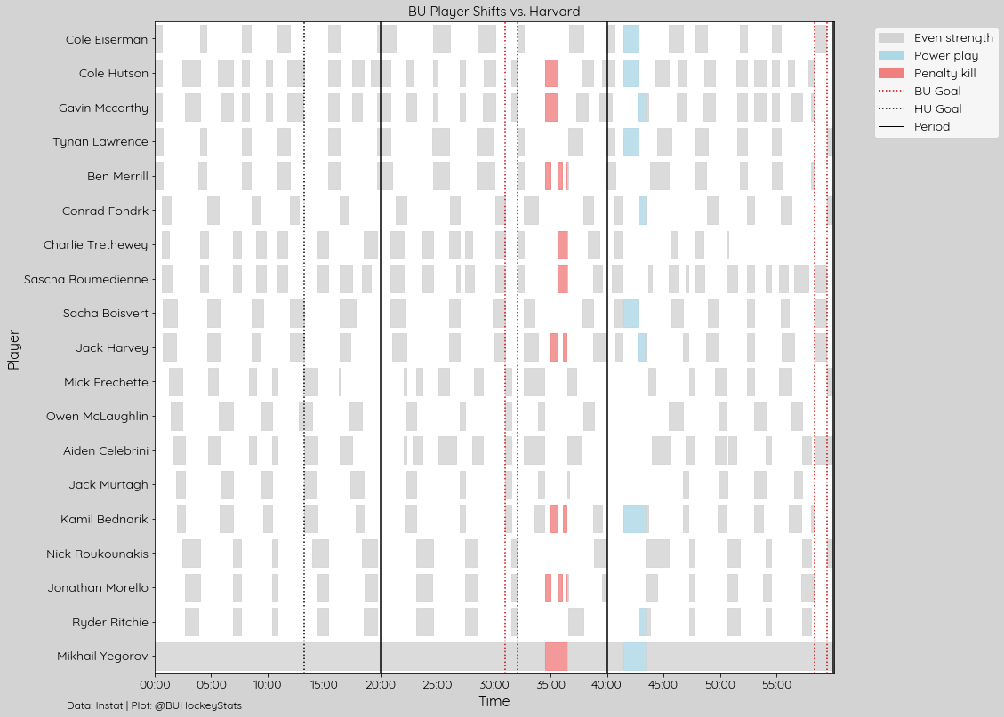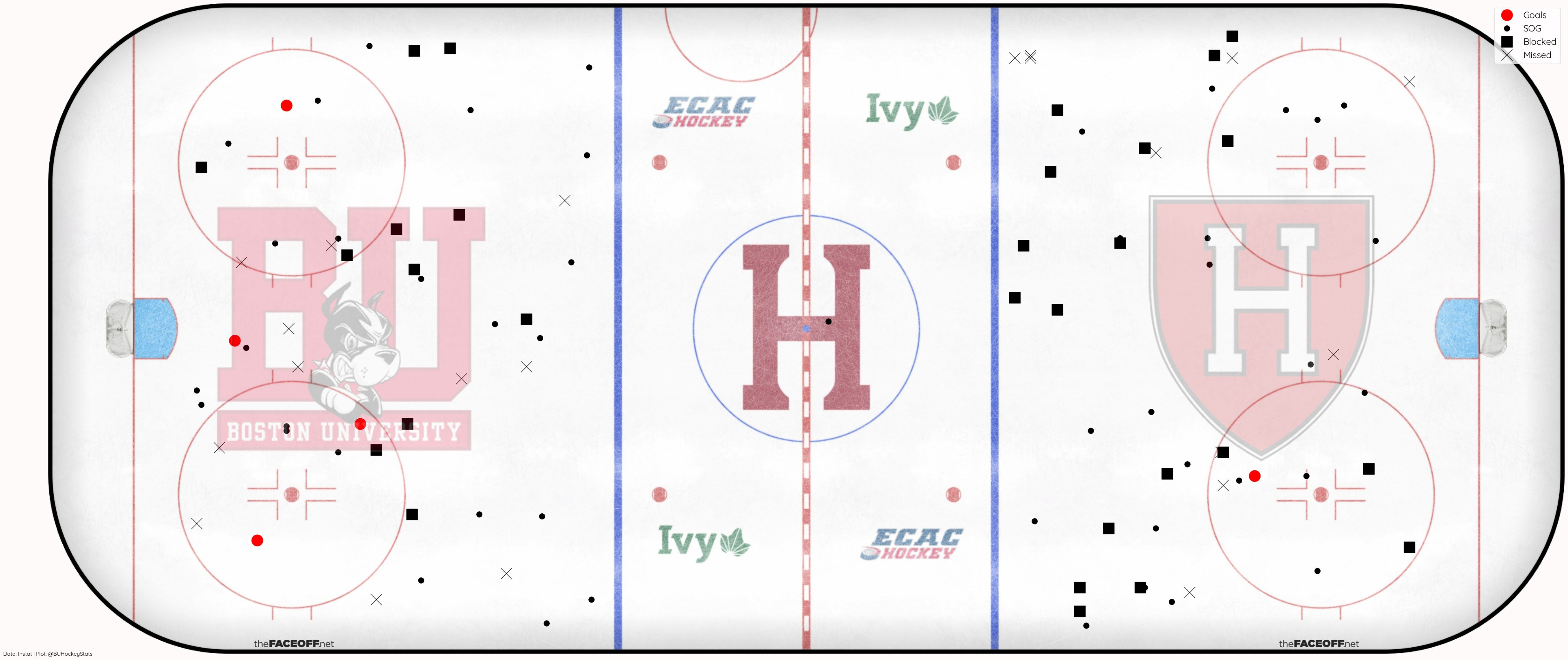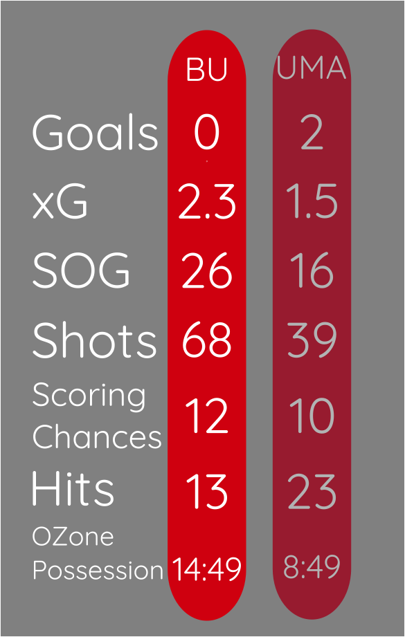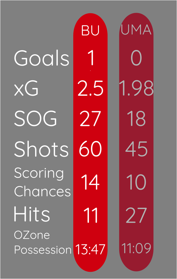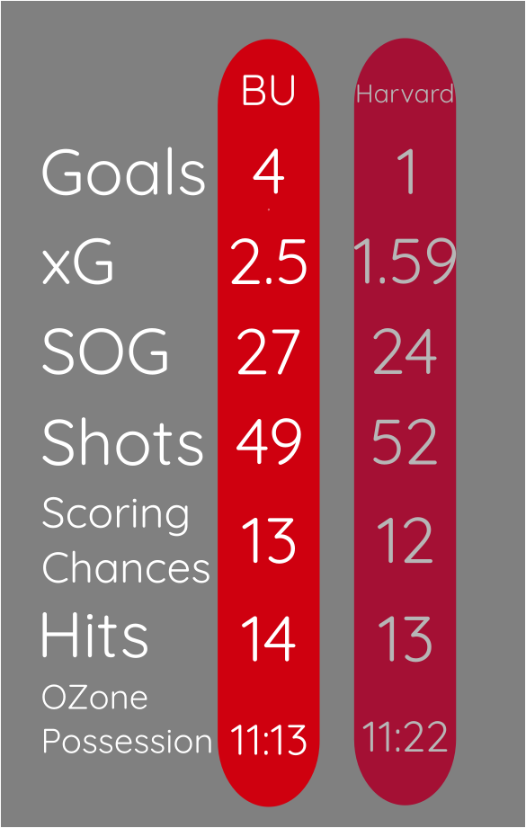 The Terriers dominated in many areas of the game, winning Puck Battles 51%-49%, Possession at EV 58% to 42%, DZone Faceoffs 60%-44%, Neutral Zone Faceoffs 55%-45%, and OZone Faceoffs 56%-40%.