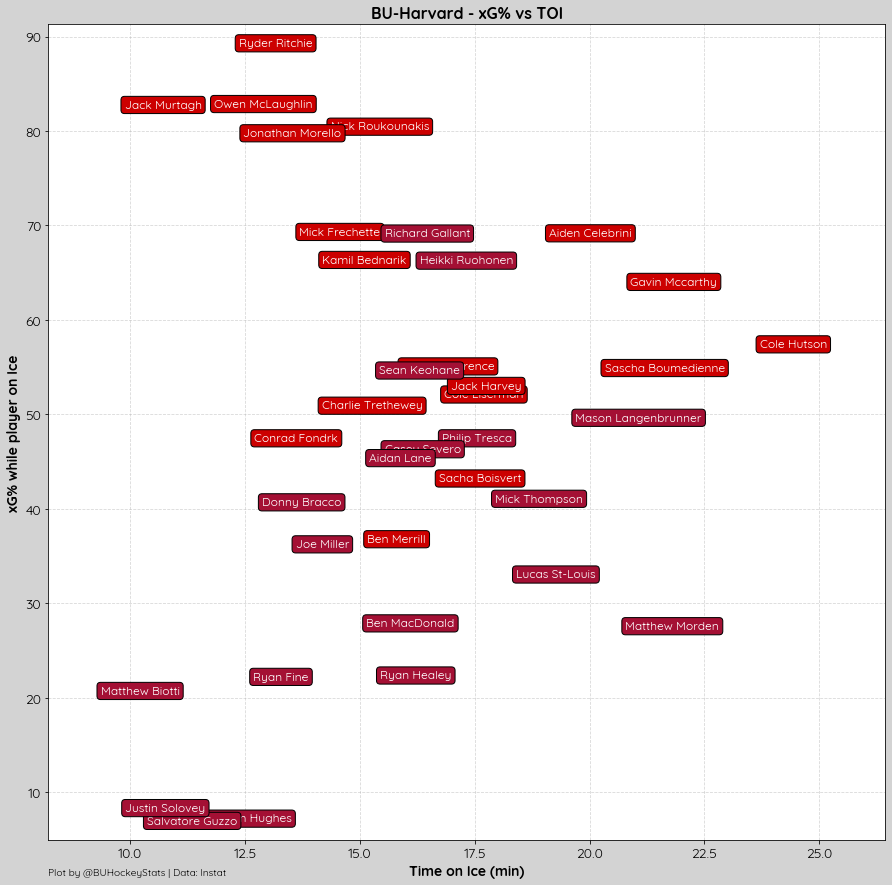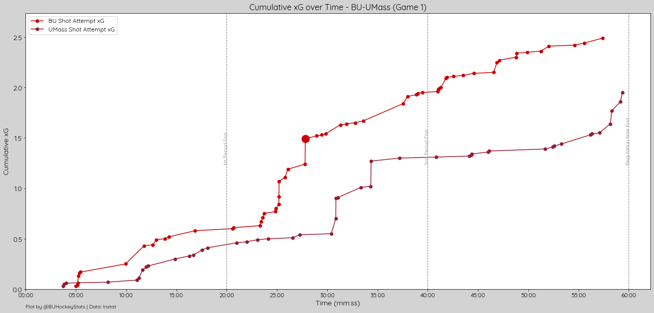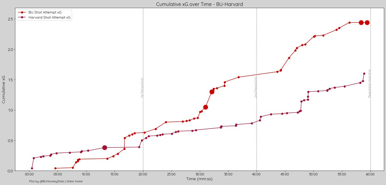 After Harvard took the xG edge early in the game, but after Harvard’s goal, BU took the advantage and kept it and expanded it the rest of the game.