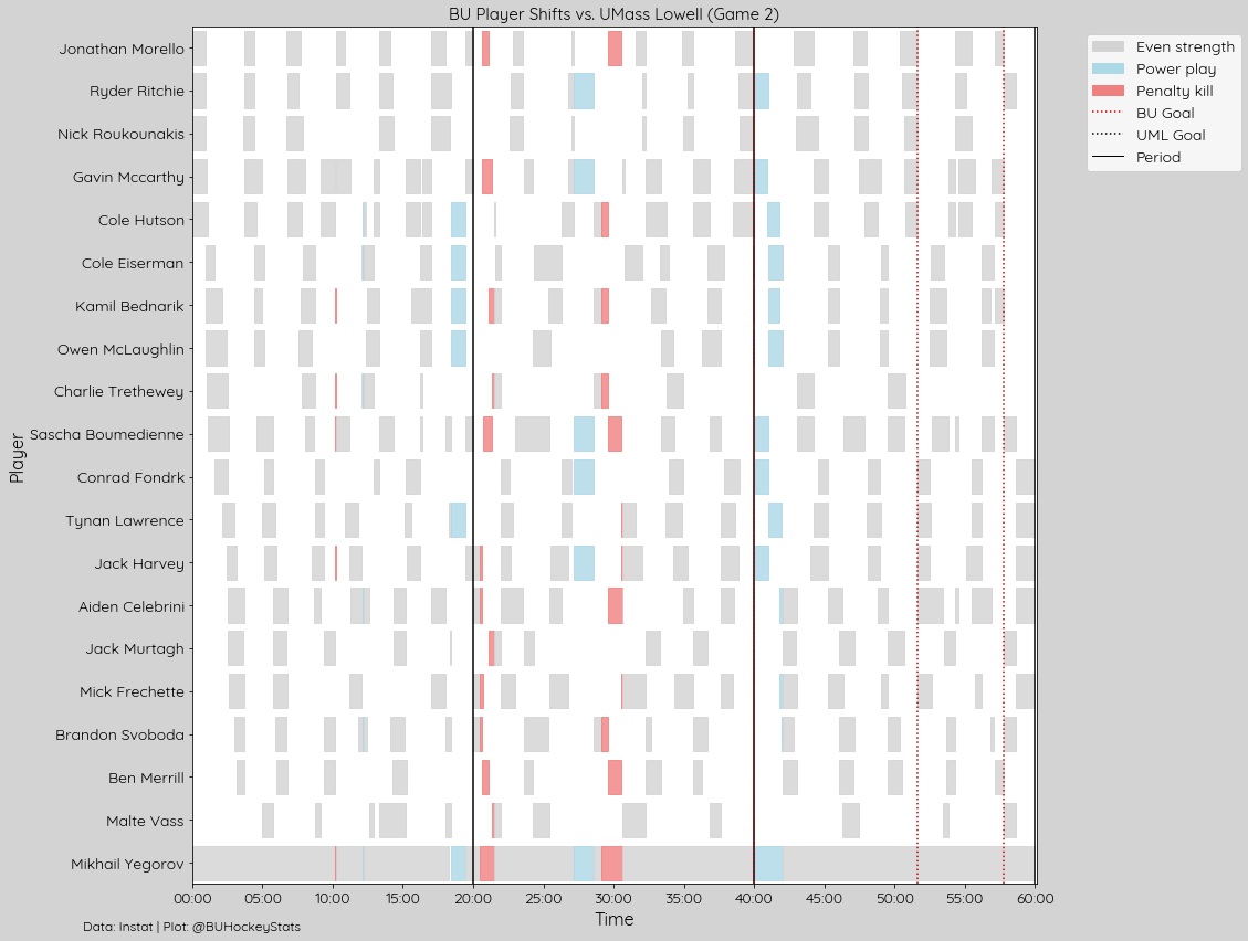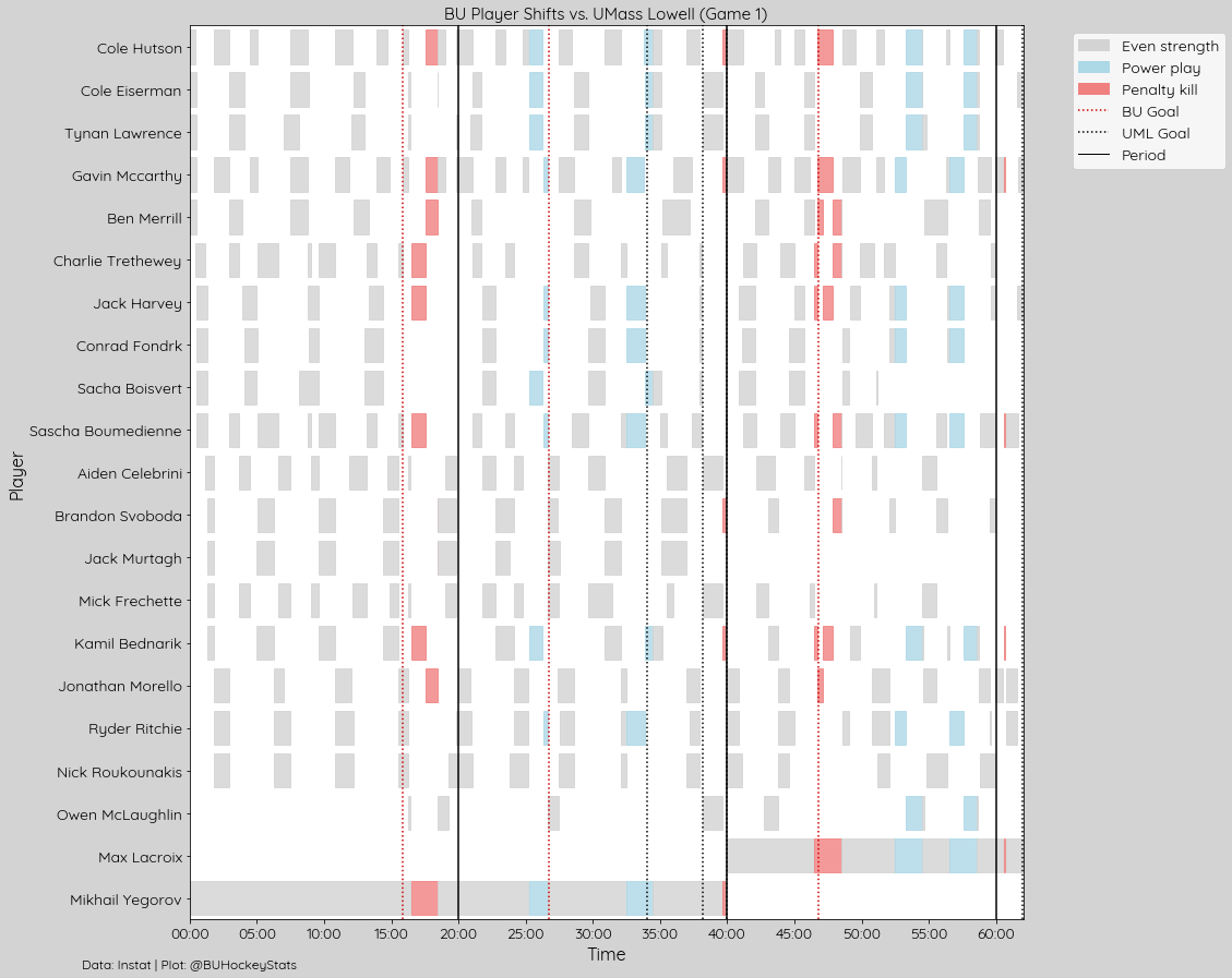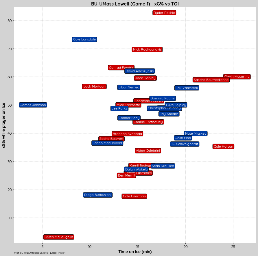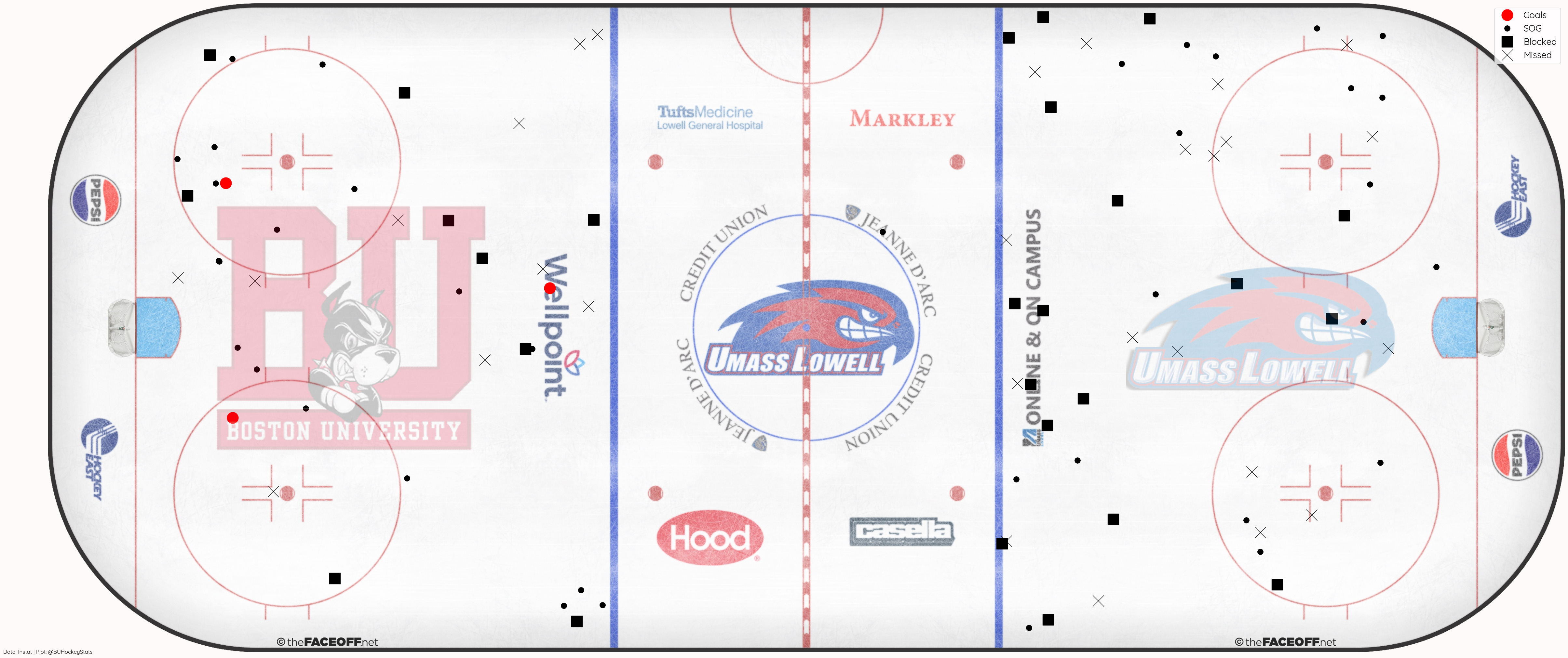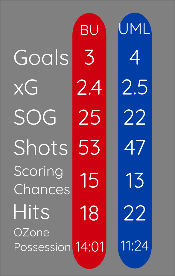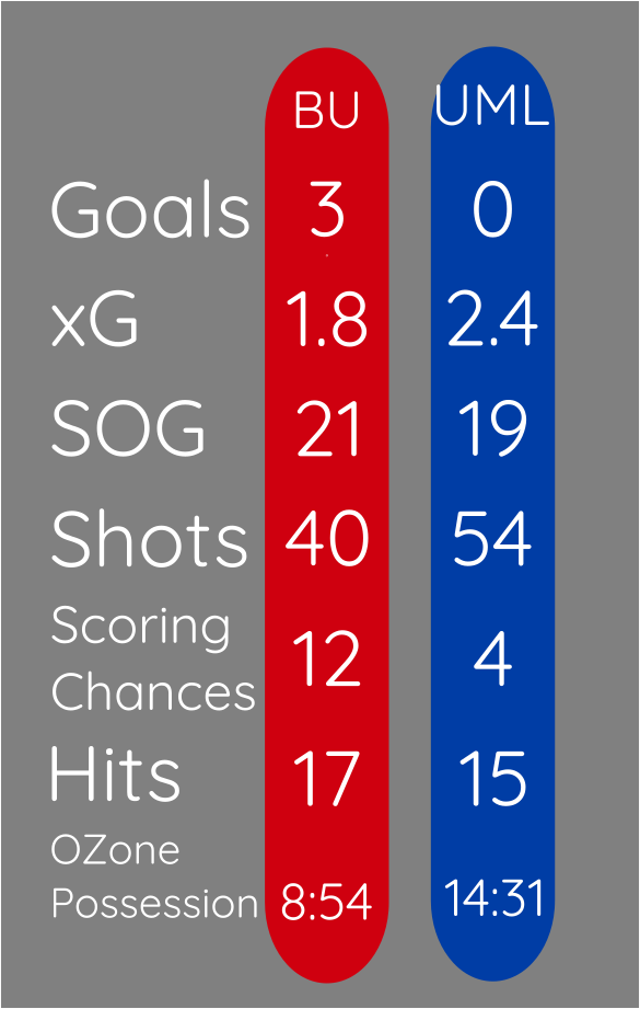 BU won Puck Battles 52%-48%, Possession at EV 52%-48%, as well as faceoffs in every zone, OZone (54%-37%), NZone (53%-47%), DZone (63%-46%). They also recorded a shot 81% of the time they recorded OZone play.