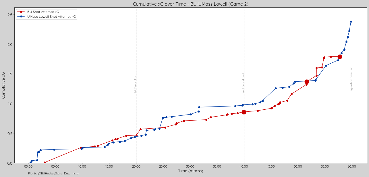 Per Period xG: 1st (0.46-0.44, BU), 2nd (0.4-0.54, UML), 3rd (0.93-1.4, UML)