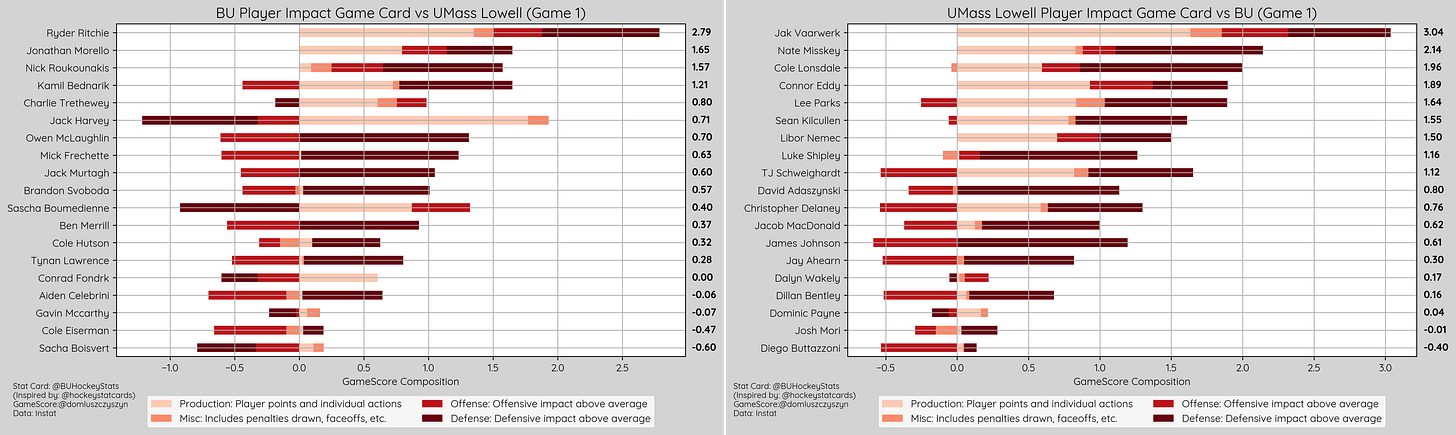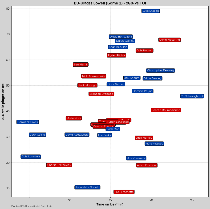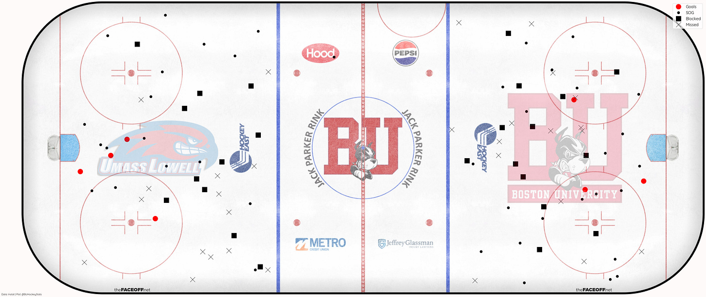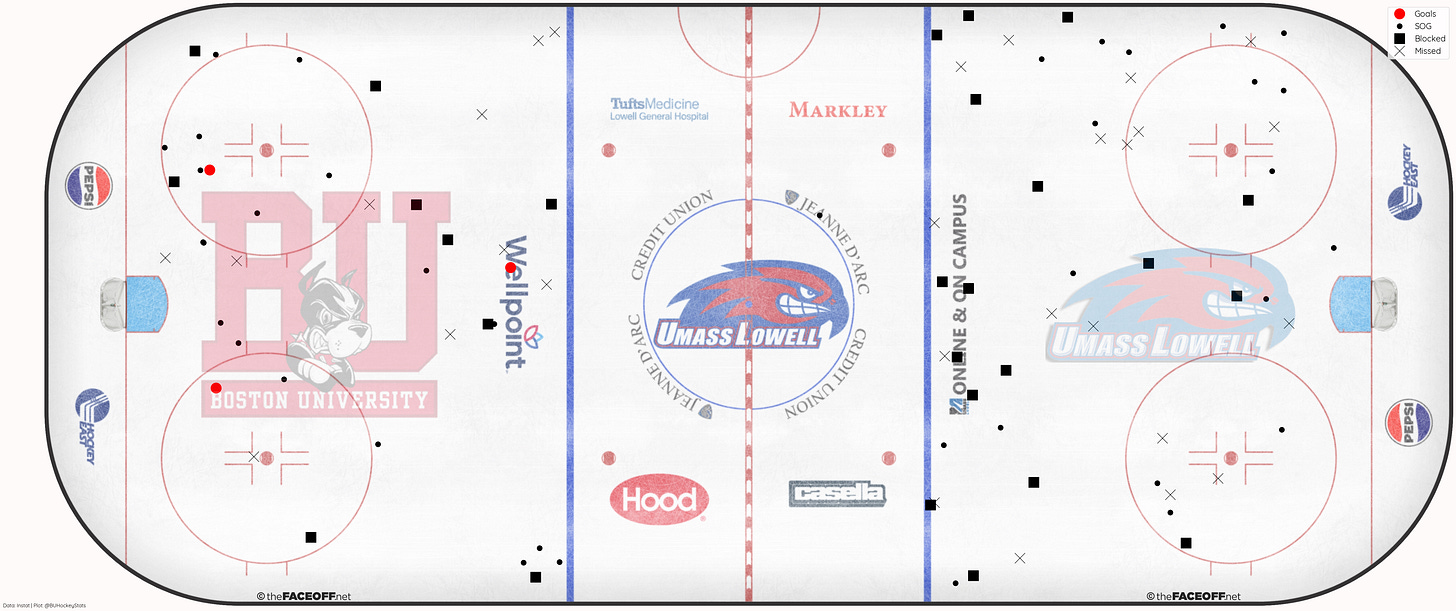 BU recorded just 1 high danger shot (.25 xG) which was saved compared to Lowell 4 (.9 xG), 1 resulted in a goal (.20 xG), 2 were saved (.5 xG), and 1 missed the net (.2 xG).