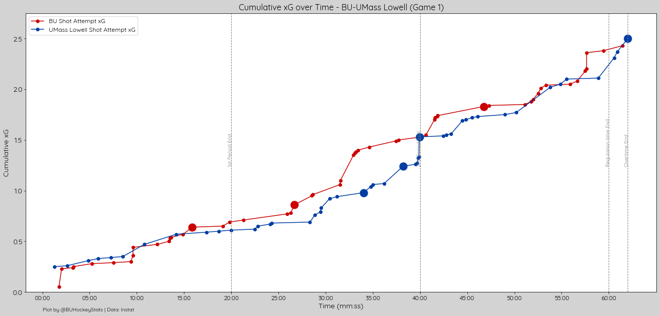 Per Period xG: 1st (0.69-0.61, BU), 2nd (0.81-0.92, UML), 3rd (0.88-0.58, BU), OT (0.05-0.39, UML)