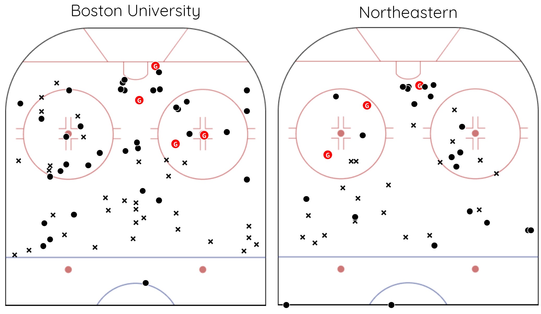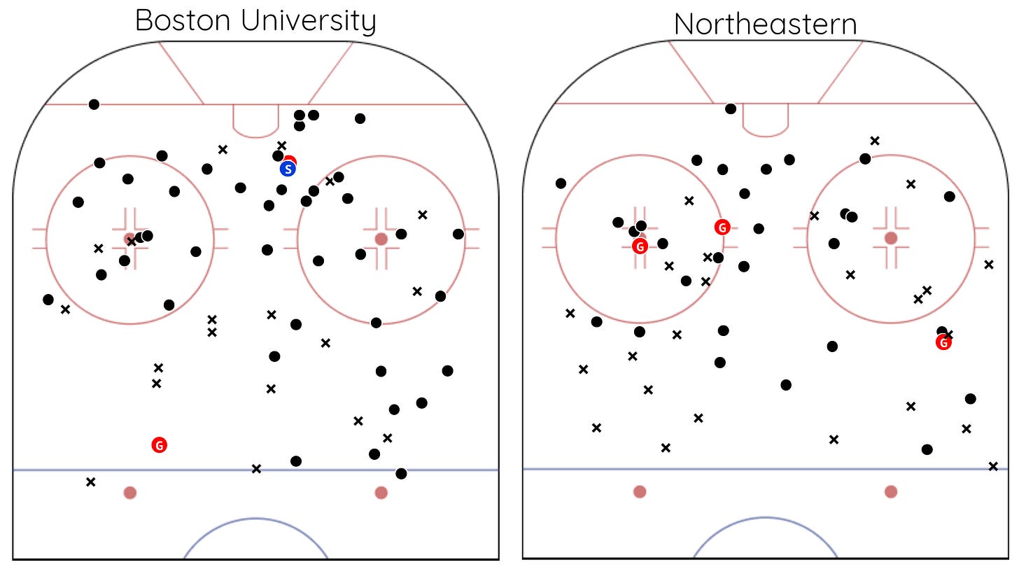 BU recorded 7 high danger shots (1.98 xG) with 1 resulting in a goal—Roukounakis’ 1st period goal—5 were saved, and the remaining one missed the net. NU record 3 (.69 xG) all of which were saved by Mikhail Yegorov.