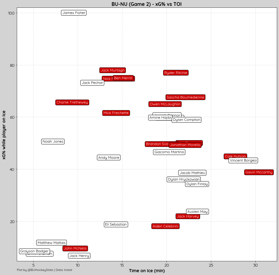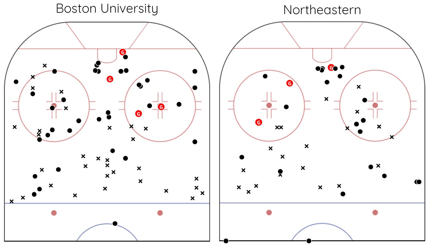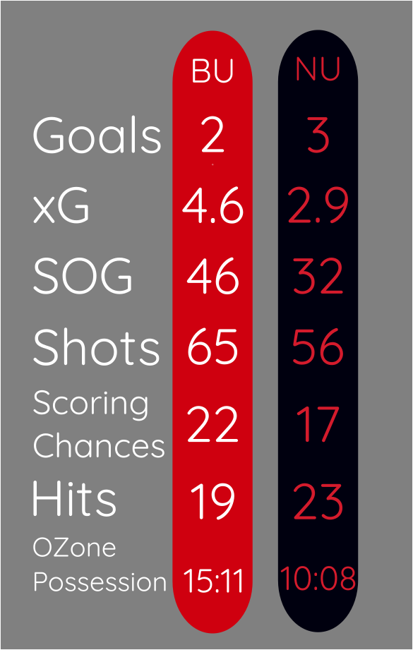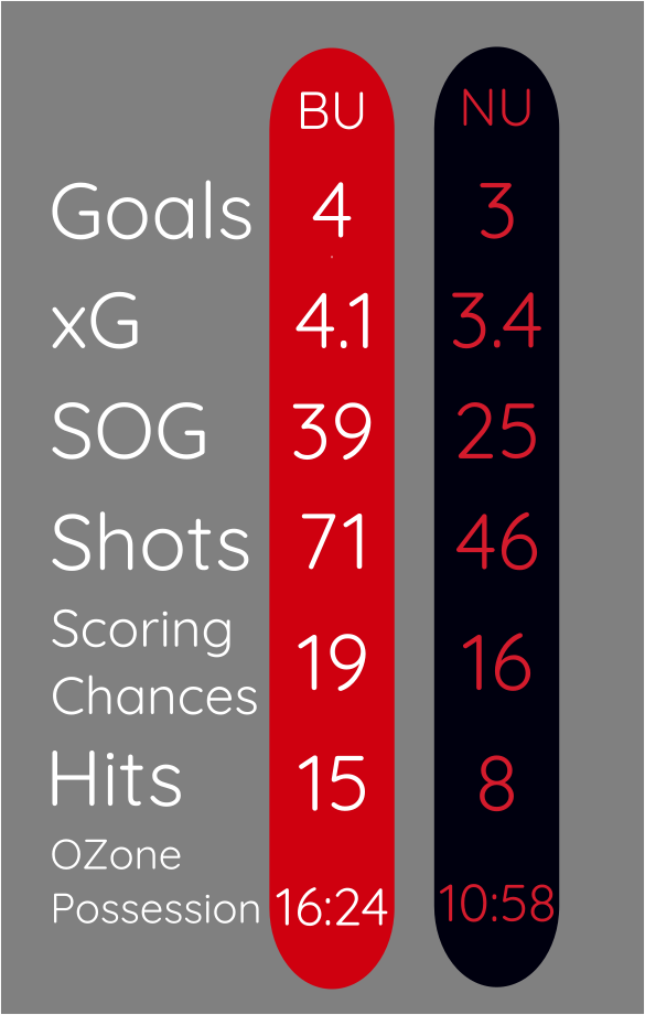 The Terriers were dominant on the night, maintaining possession at EV 57% to 43%, winning puck battles 56% to 48%. Faceoffs were even in the OZone (55%-55%) and DZone (45%-45%) with NU holding the edge in the Neutral Zone (46%-54%).