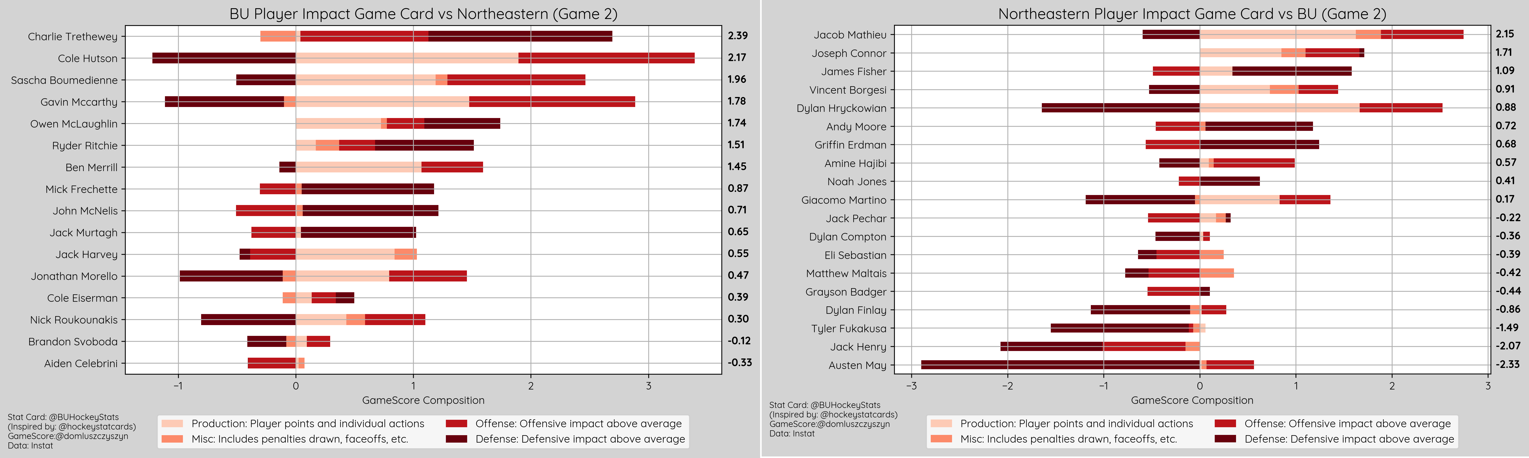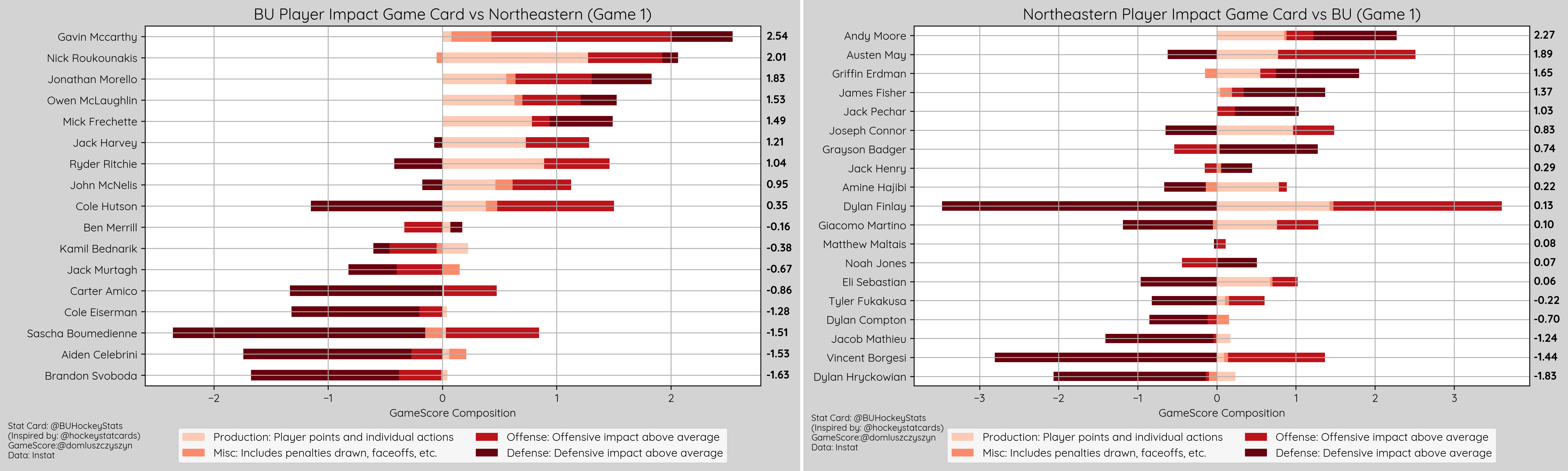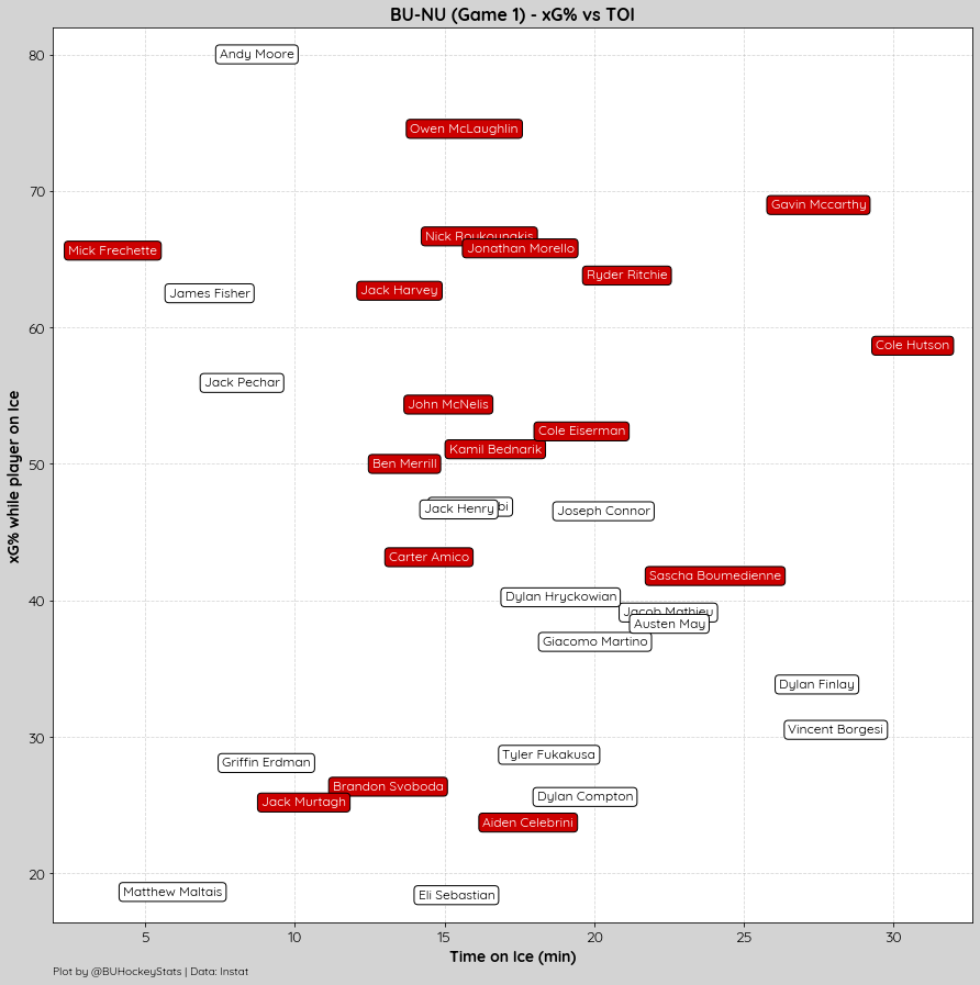 The Terriers were dominant on the night, maintaining possession at EV 57% to 43%, winning puck battles 56% to 48%. Faceoffs were even in the OZone (55%-55%) and DZone (45%-45%) with NU holding the edge in the Neutral Zone (46%-54%).
