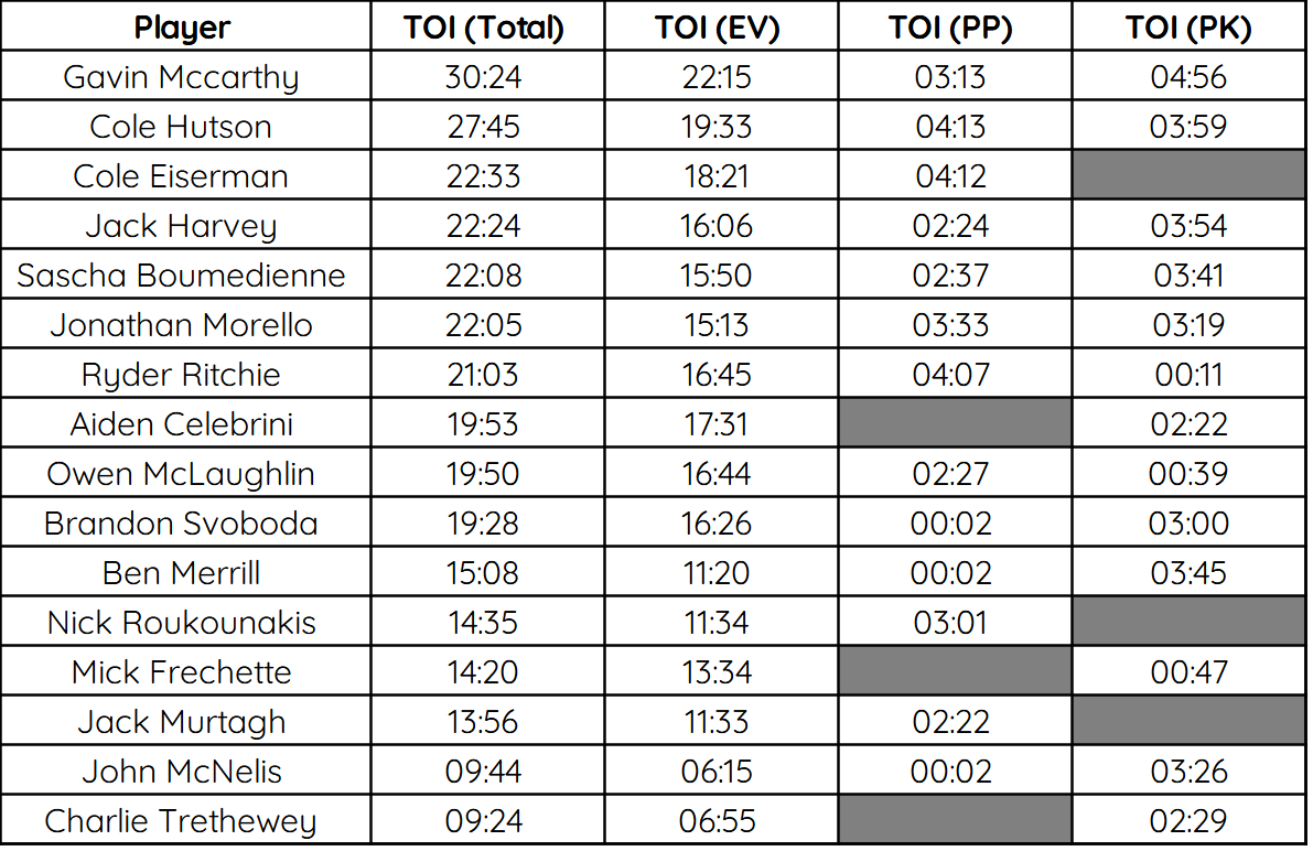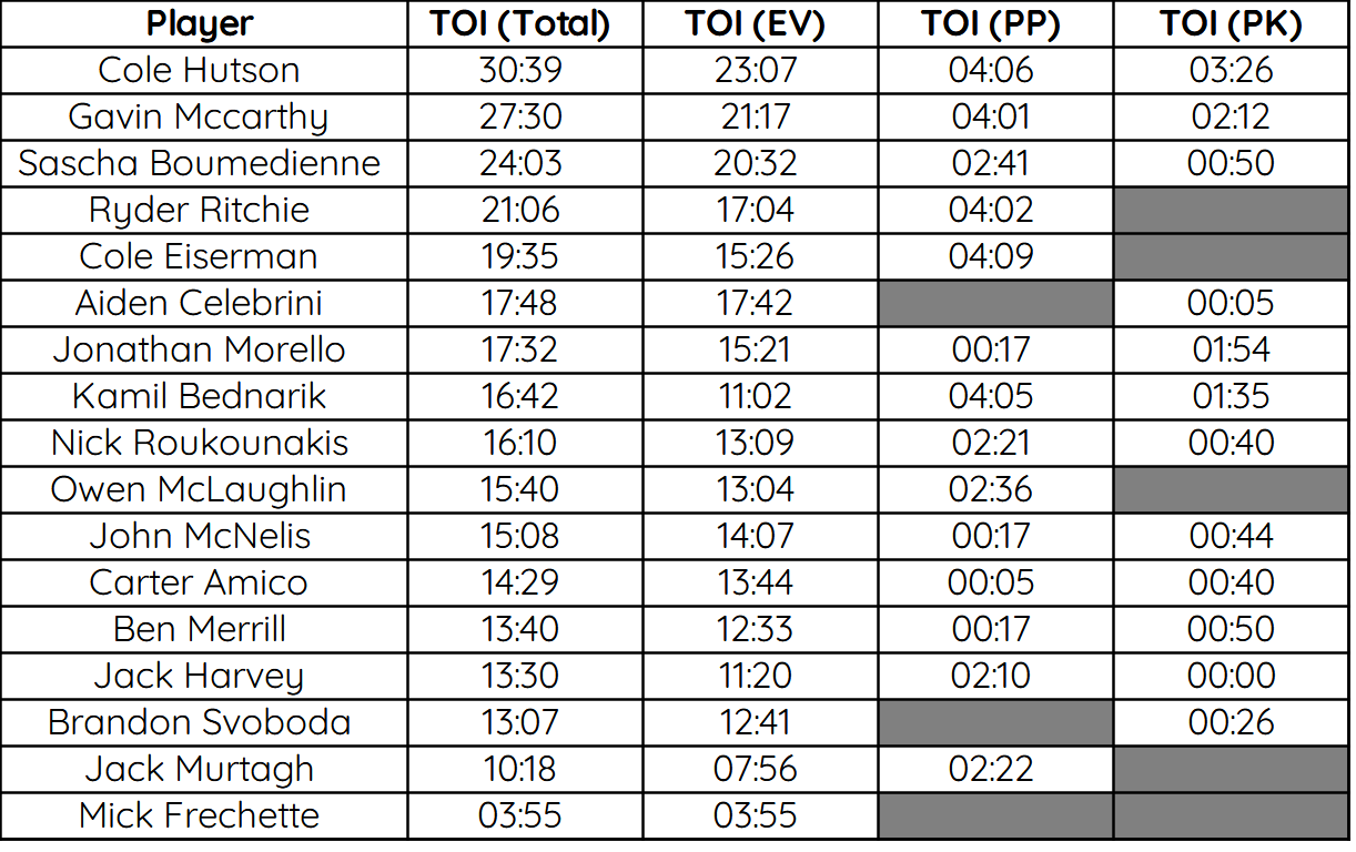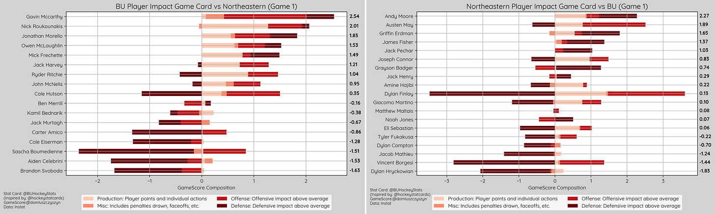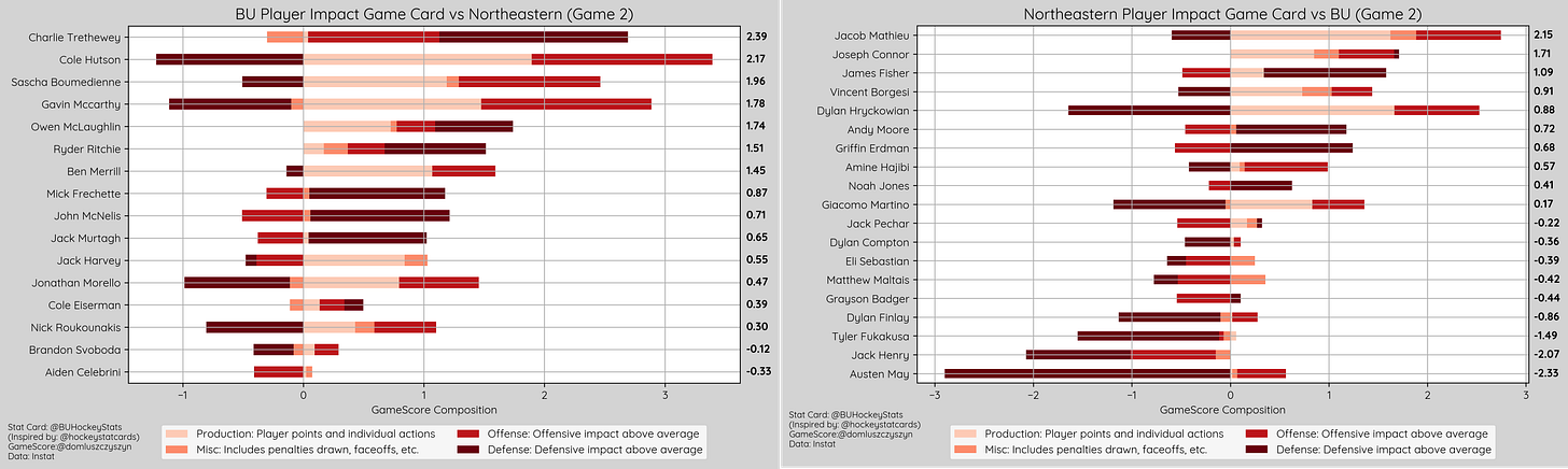 BU recorded 5 high danger shots (1.39 xG) compared to NU’s 6 (1.68 xG), will but 1 of BU’s being saved (1.14 xG) the sole exception being Cole Hutson game winning goal (.25 xG). On the other end of the ice, Mikhail Yegorov saved 5 (1.39 xG) of 6.