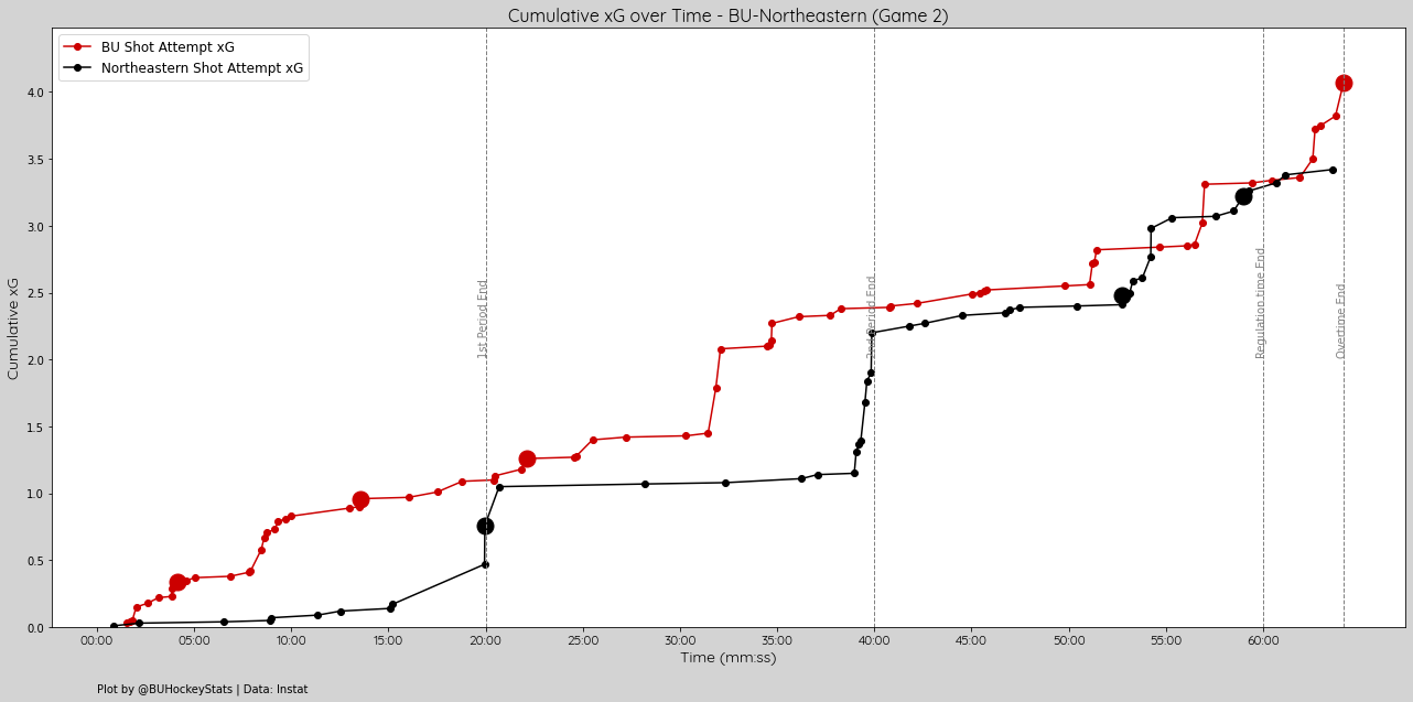 The xG differential was back and forth has NU took the lead for the first 22 minutes of the game before BU took control for the rest.