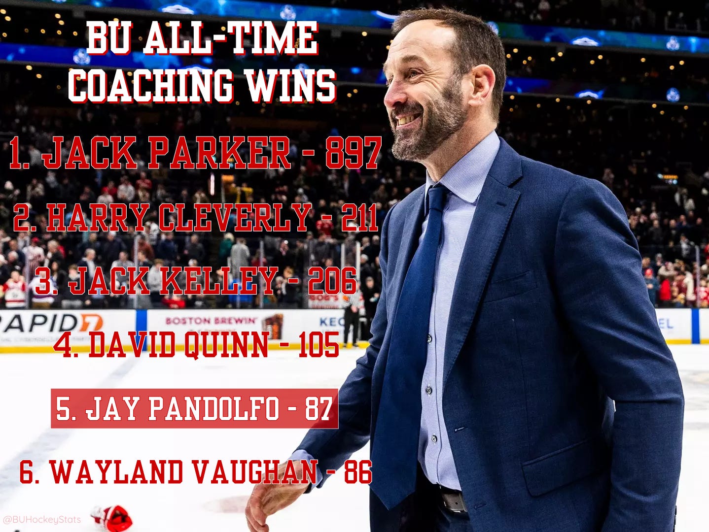 In the Jay Pandolfo era, BU has won 11 overtime goal, 8 of those game winning goals were scored by a Hutson—Lane (4), Quinn (2), Cole (2).