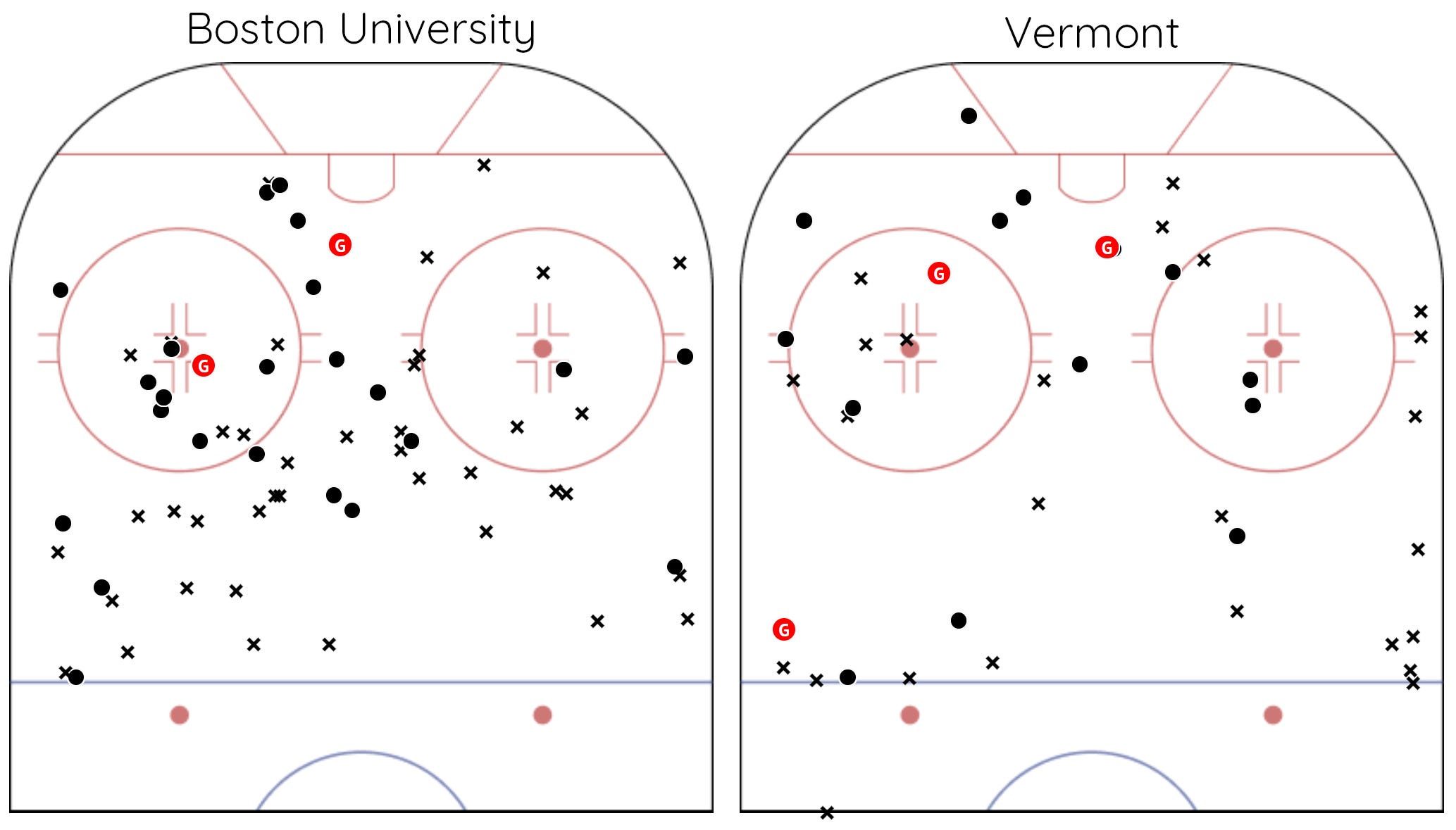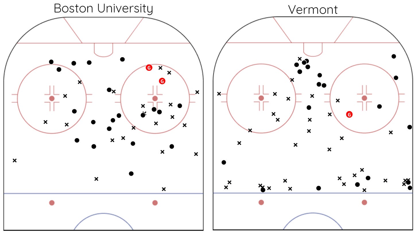 The Terriers performed better on Saturday, except in the most important metric—goals. BU had nearly double UVM’s OZone Possession and overall held the possession edge 58% - 42%. In an inverse of Friday night it was Vermont that had the edge in Faceoffs winning in the OZone 42%-53% and DZone 47%-58% while BU had the neutral zone edge at the dot 59%-41%.