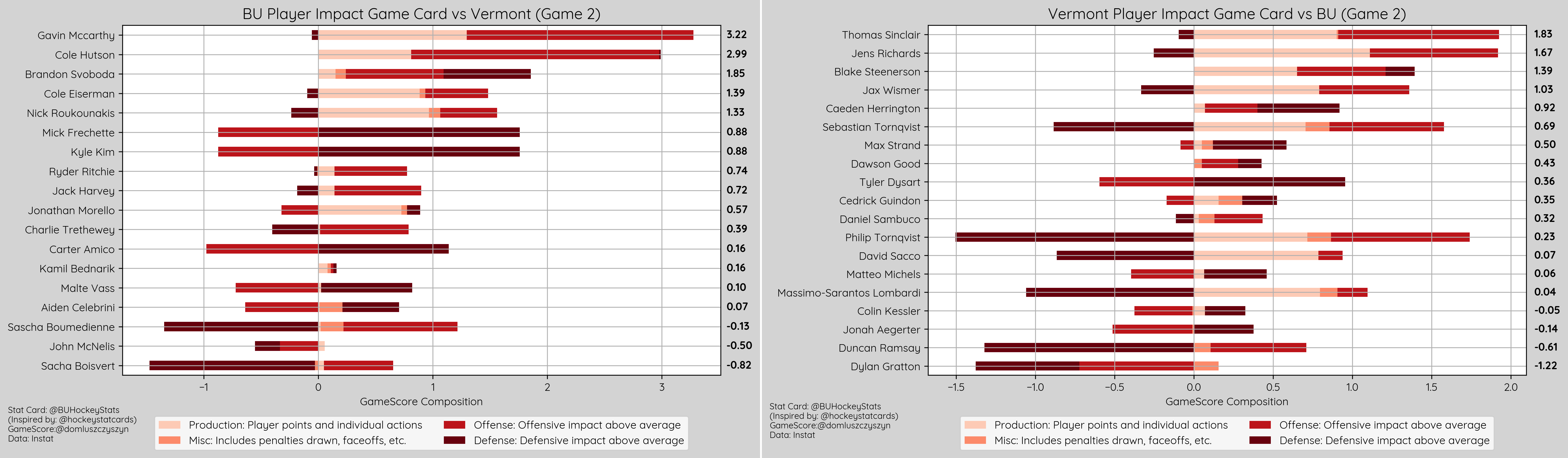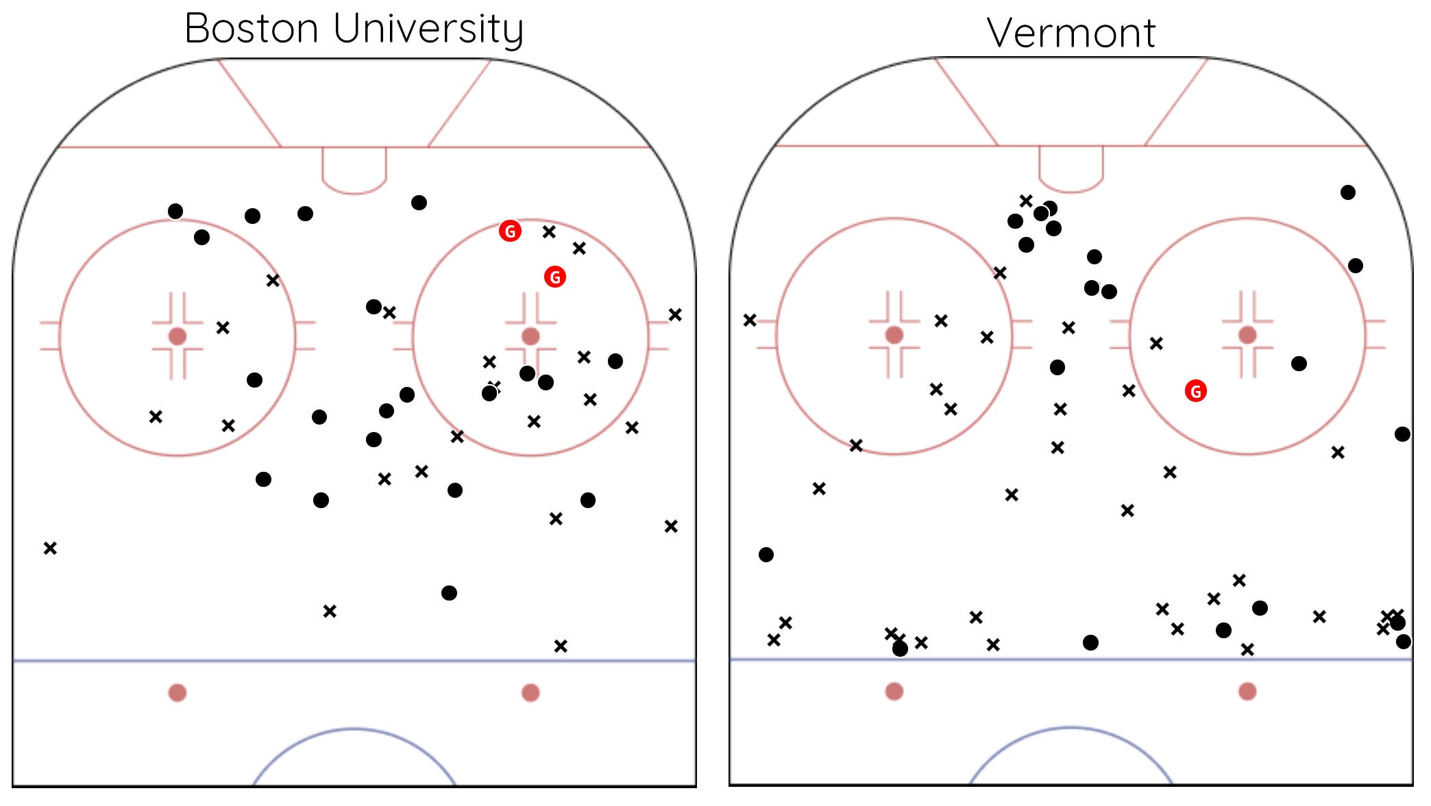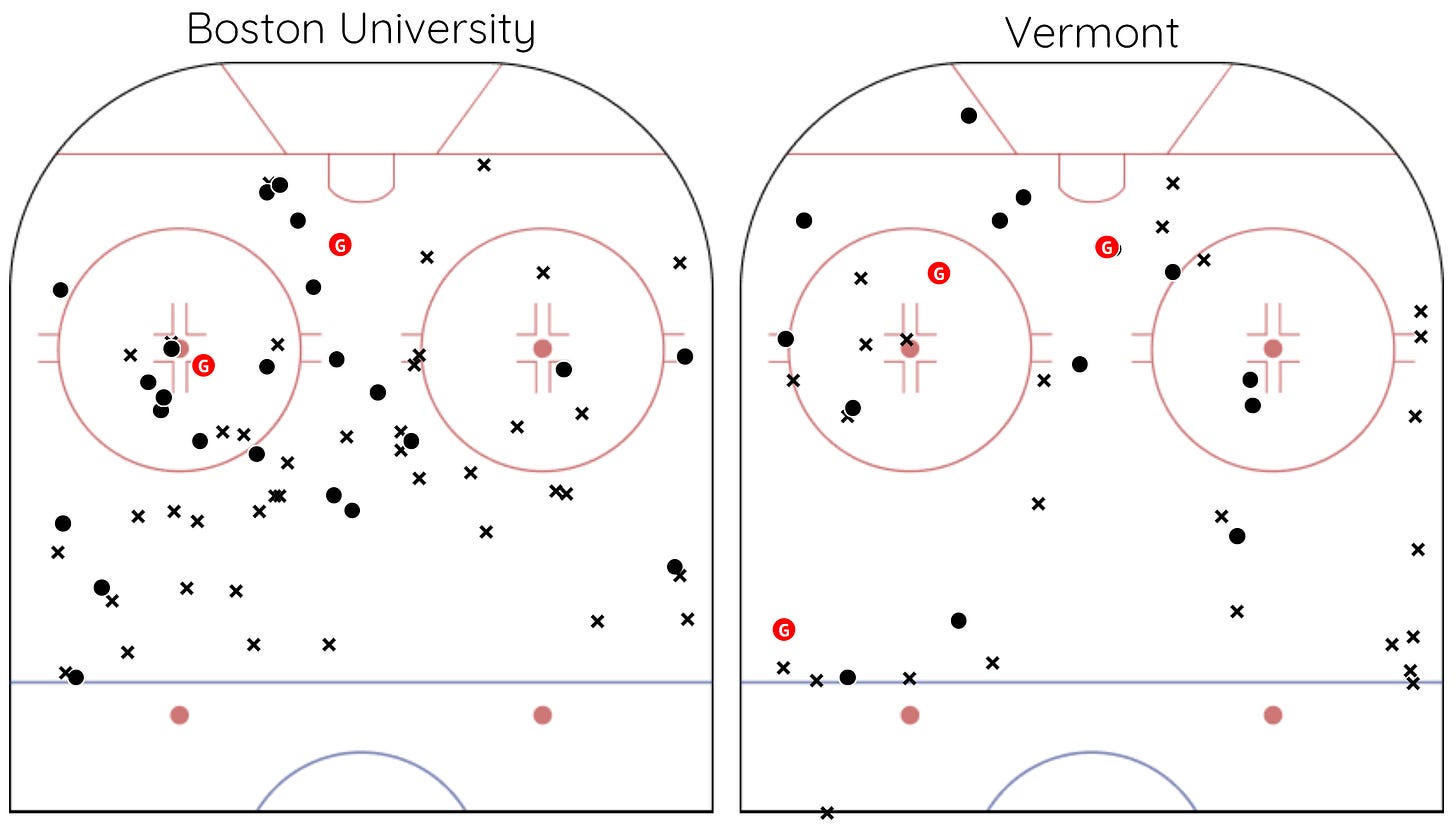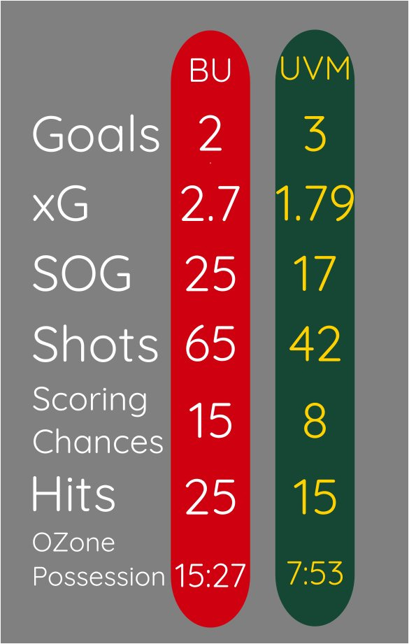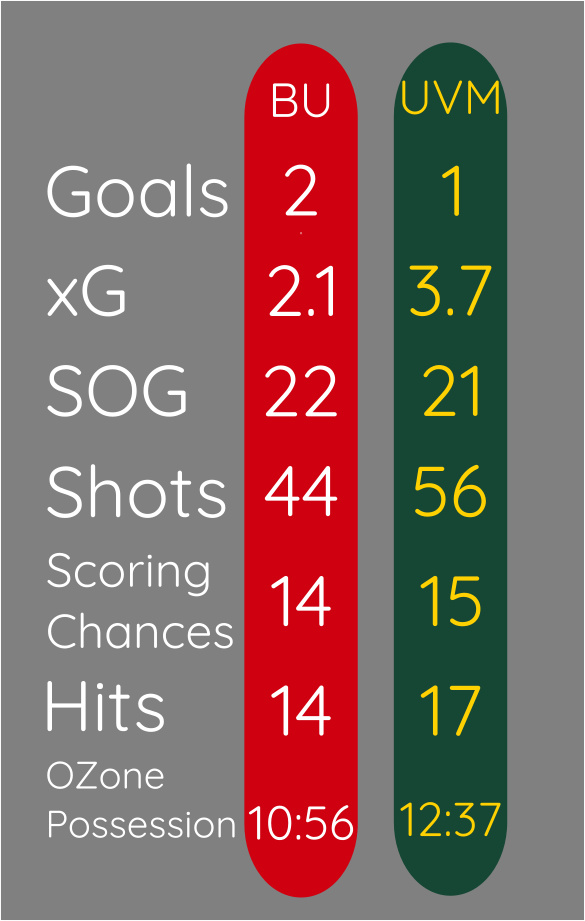 The Terriers earned the win in an even game with the Catamounts. At even strength, UVM held the possession edge 55% to 45%. Puck Battles were even at 50% each. BU dominated OZone draws 61% to 35% and DZone draws 65% to 39% while Vermont took Neutral Zone faceoffs 41%-59%.