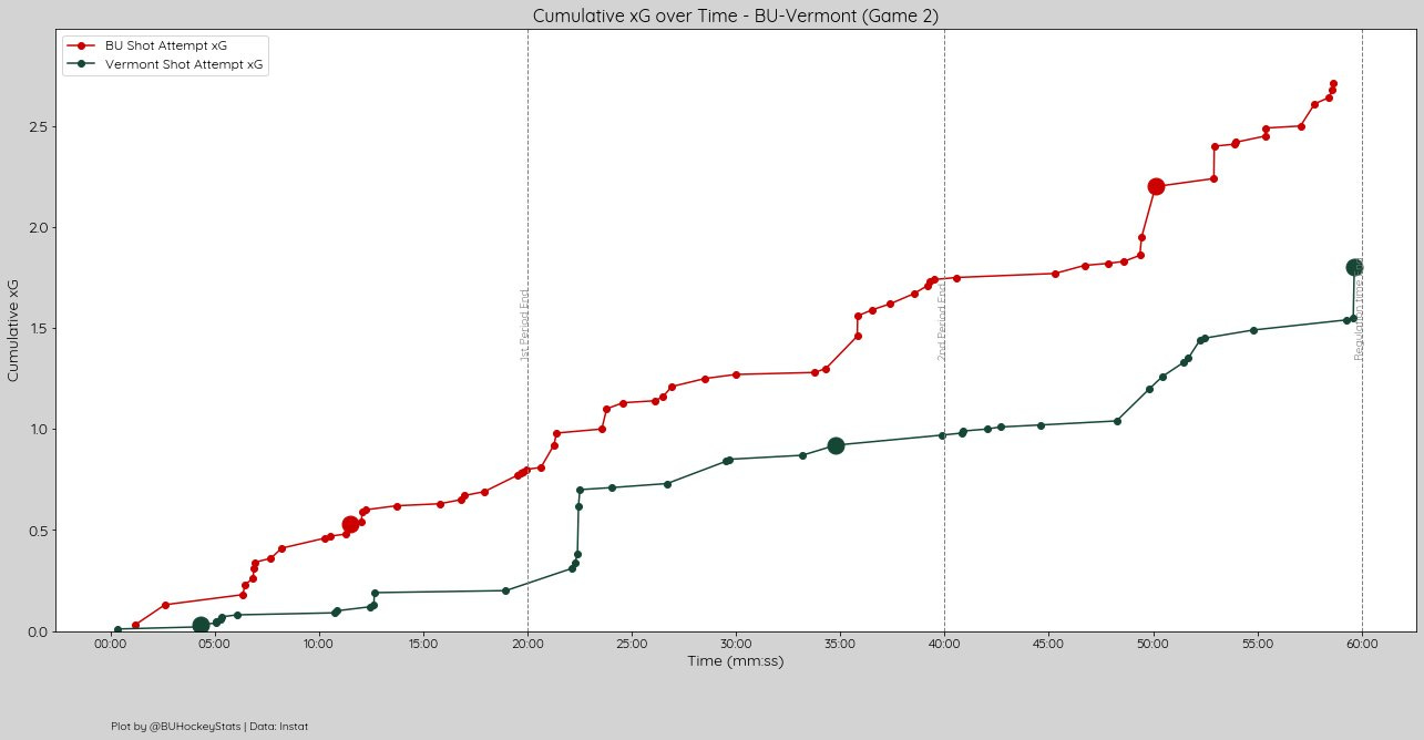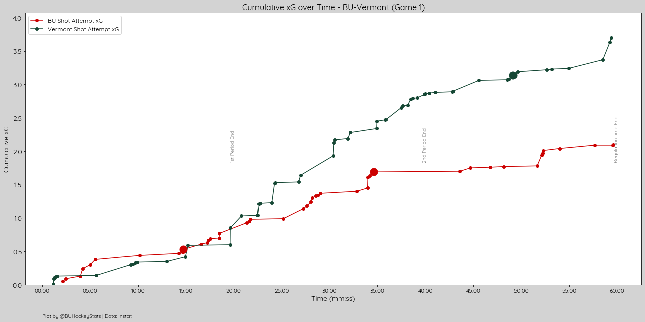 After the first period, BU was at an xG deficit for the entirety of the rest of the game, maxing out at the end at -1.6.