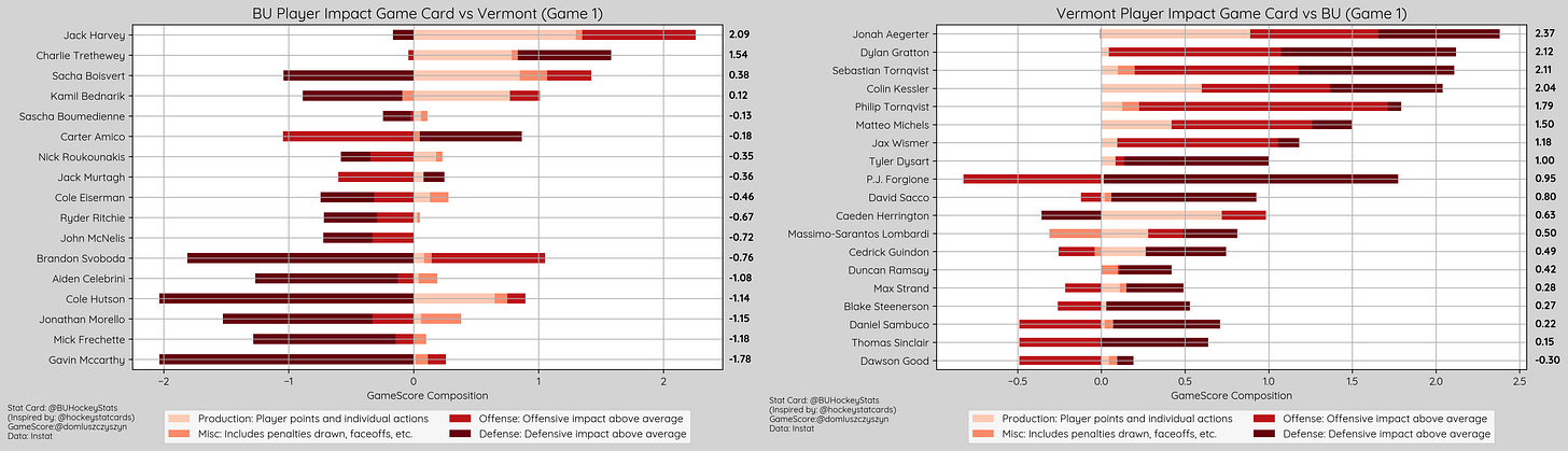 BU recorded 0 high danger shots for the second time this season—last time October 31st vs. Maine. Mikhail Yegorov saved all 5 Vermont high danger chances (1.29 xG). BU’s goals had a combined .1 xG.