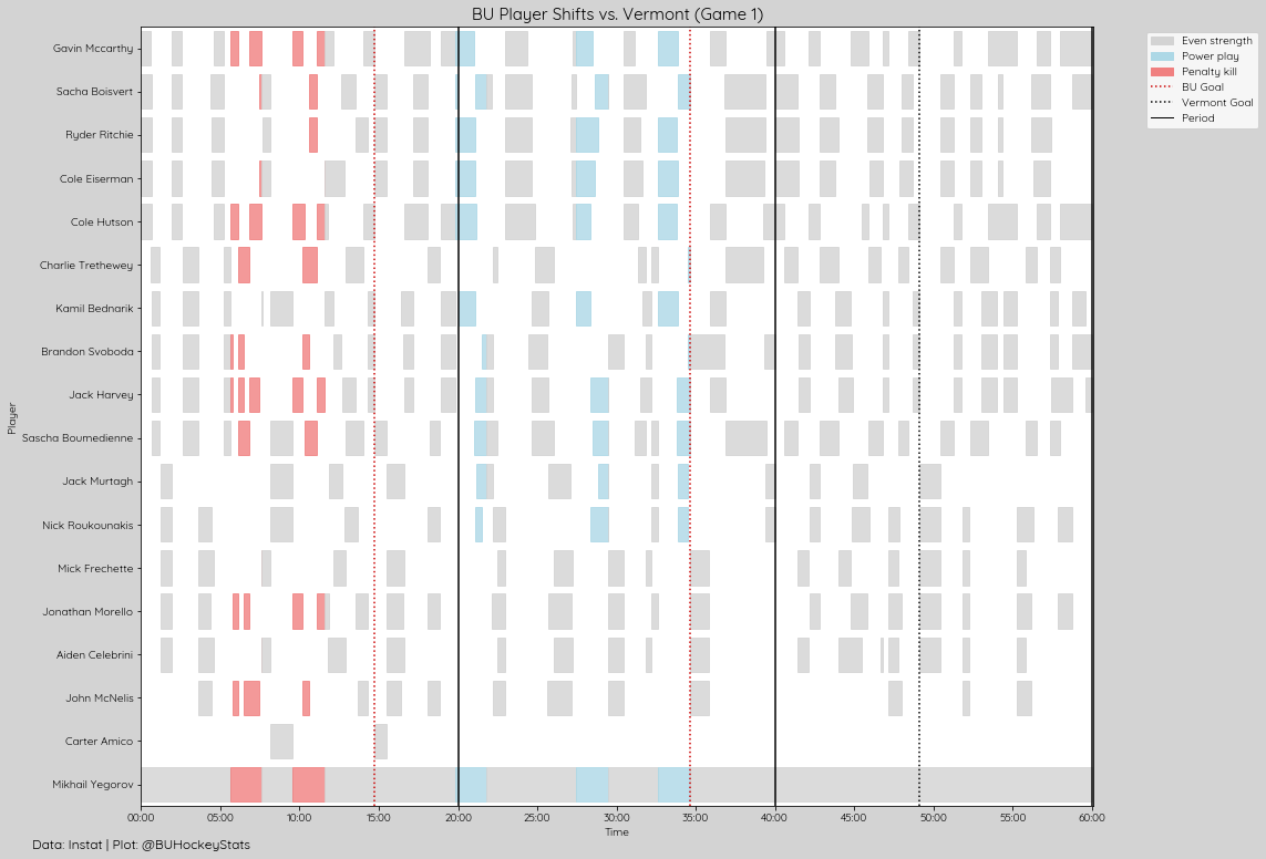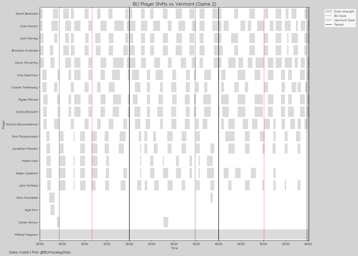 The Terriers recorded just 1 high danger shot, Nick Roukounakis’ 3rd period goal (.25 xG) while Vermont had 2 (.49 xG) one was saved by Mikhail Yegorov and one was UVM’s 3rd period goal.