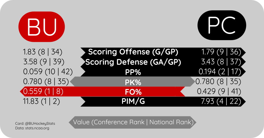 Providence comes in losers of 3 of their last 4 including getting swept by Princeton (0-3, 1-3), Junior Audrey Knapp the lone goalscorer for the Friars. The Friars are led by senior Reichen Kirchmair with 6 goals and 12 points and Knapp, who leads in assists with 9 and is tied with Kirchmair in points. In net, Hope Walkinski has played every game for the Friars and holds a 3.14 GAA and .906 SV%.