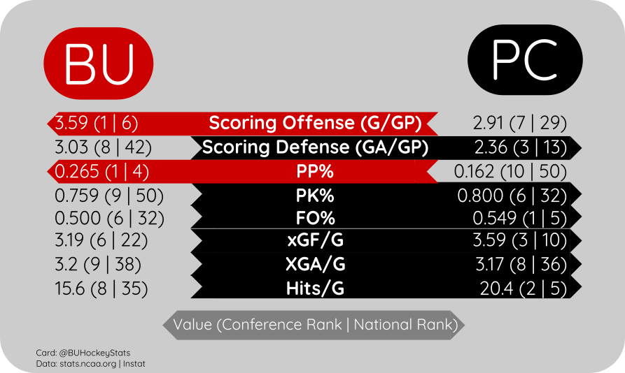 Since they last met, the Friars have won 3 in a row, including a sweep of Merrimack over the weekend (3-2, 2-1). On Friday night, PC got into a 2 goal hole, before scoring three unanswered, including goals from team leading goalscorers Graham Gamache (10) and Tanner Adams (11). On Saturday, again the Friars got in a hole, giving up a goal to Merrimack in the first before scoring two in the second, including a buzzer beater by Tomas Machu—his second goal of the season—which was the eventual game winner.