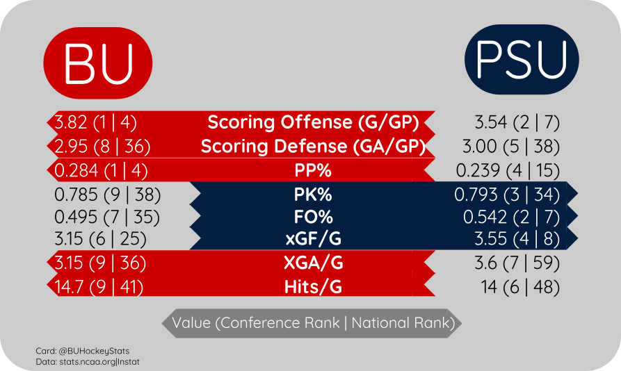 The Boston University Terriers head to their 3rd straight Frozen Four, 25th Frozen Four in program history. They will face the Penn State Nittany Lions for the first time in program history, it is the Nittany Lions’ first ever Frozen Four appearance.