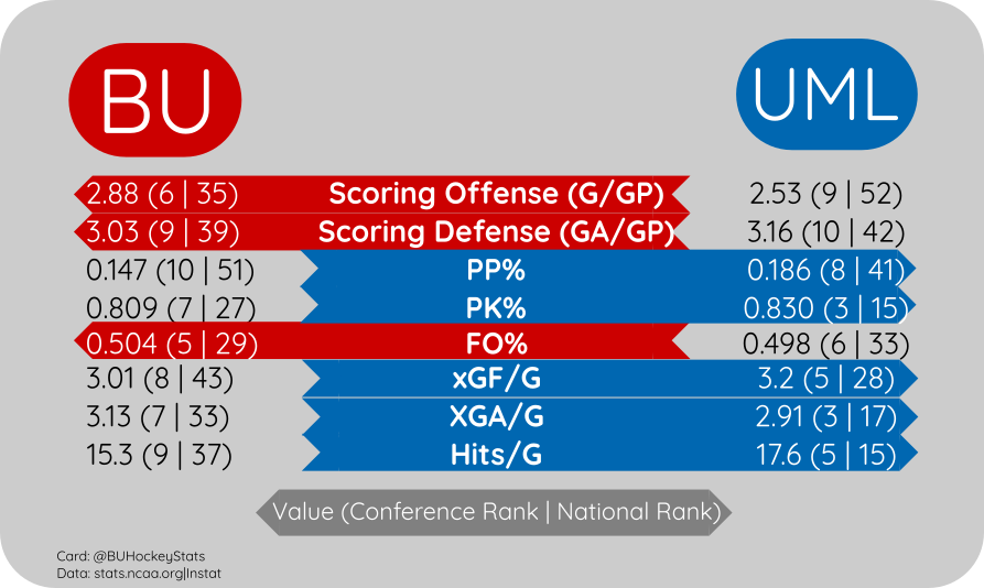 UML was off this past weekend and hold a 3-6-0 record since they last saw the Terriers including getting swept by Northeastern their last time out (0-2, 2-8). Dillan Bentley leads the River Hawks in goals (13) but scored just 2 in February.