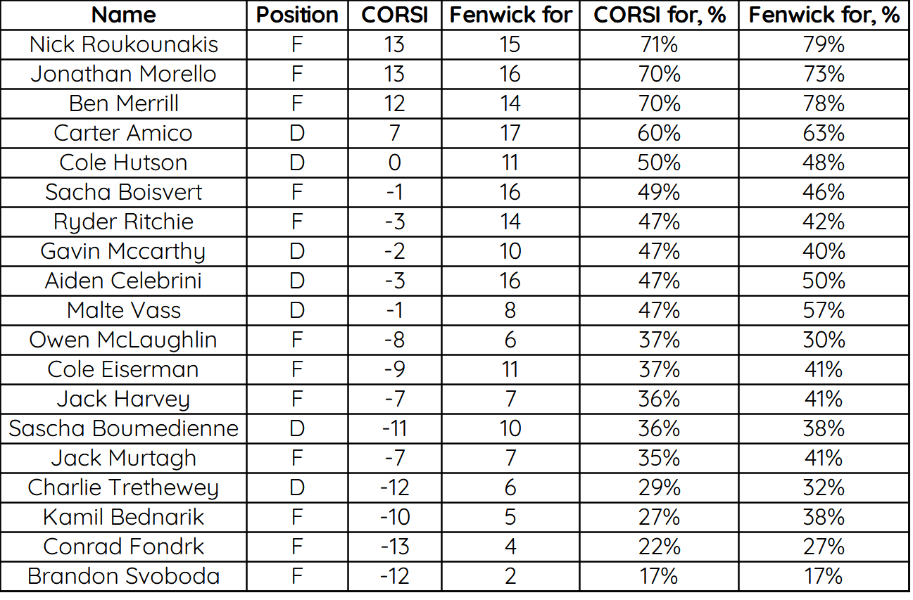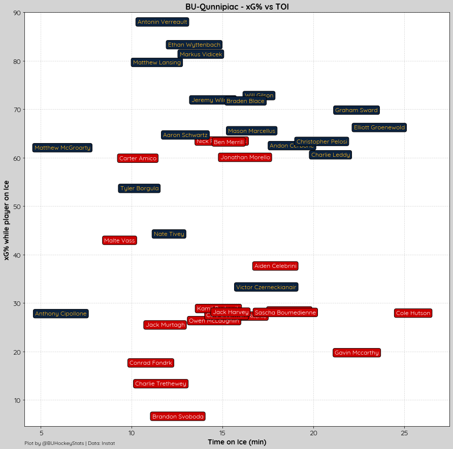 Only 3 Terriers: Nick Roukounakis, Jonathan Morello, and Ben Merrill had an xG% above 40 among Terriers with TOI>10.5 minutes.