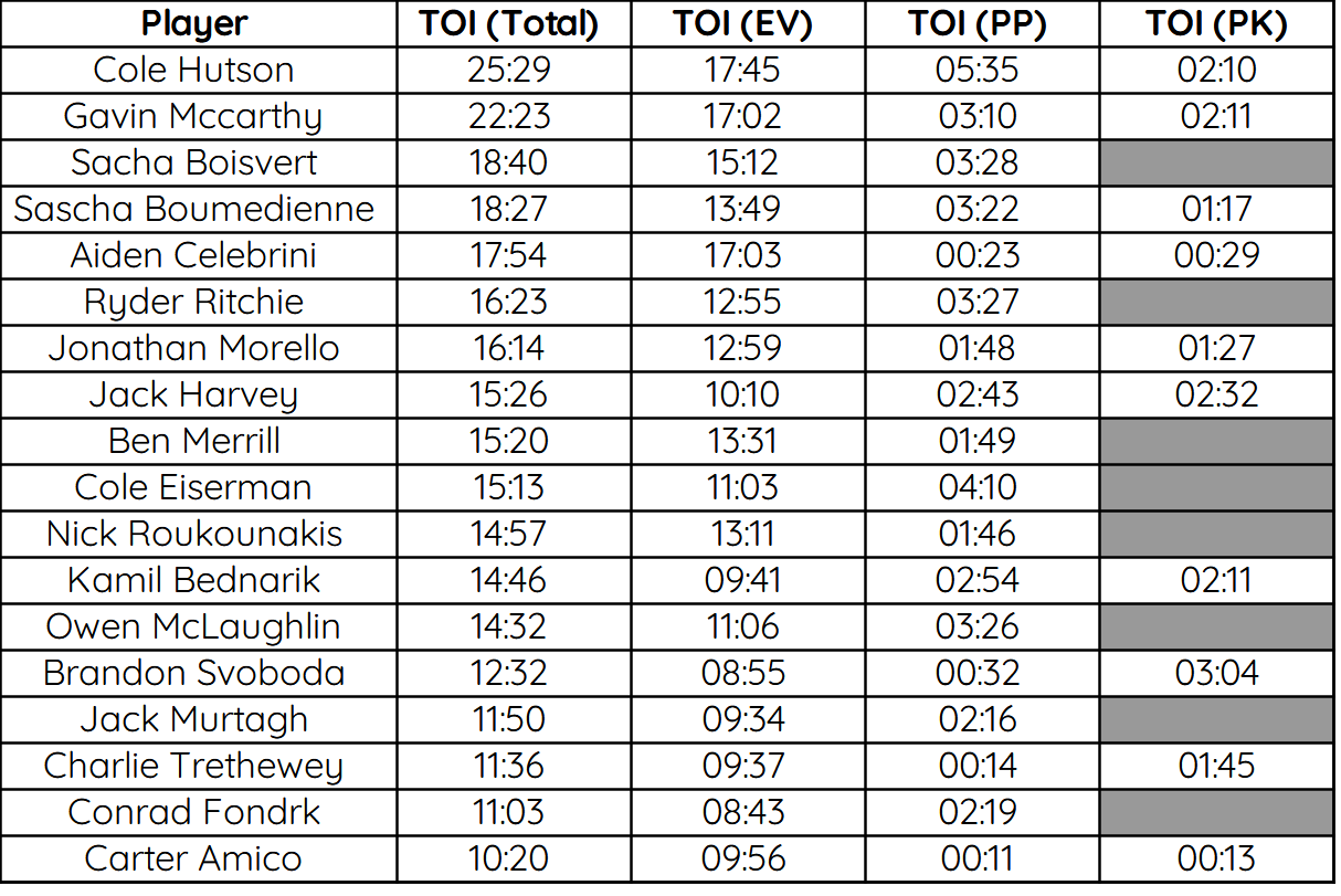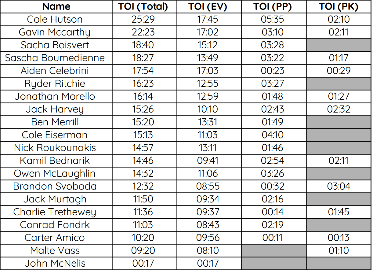Cole Eiserman returned to the lineup after missing the previous four games, and Nick Roukounakis made his season debut, returning from injury.