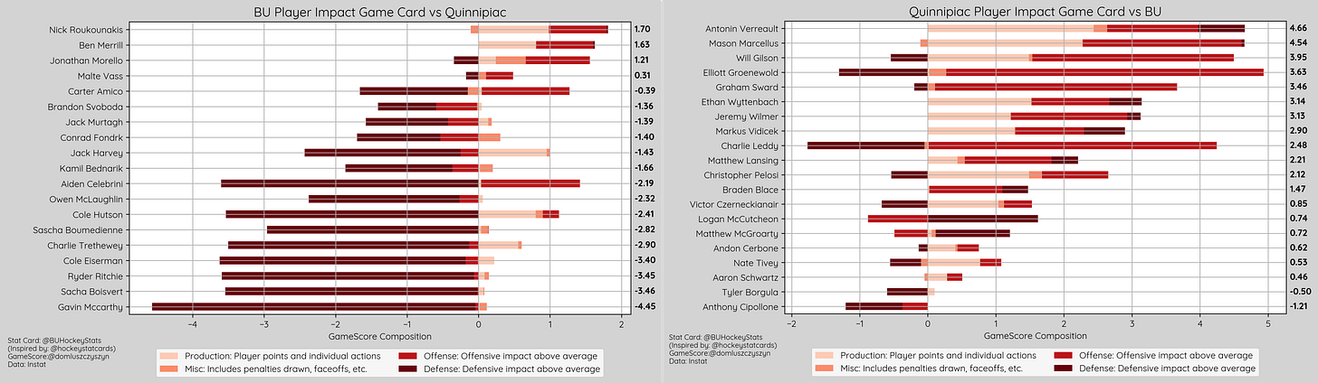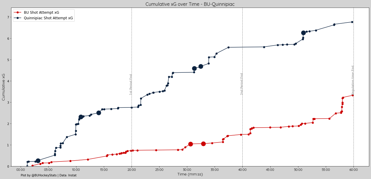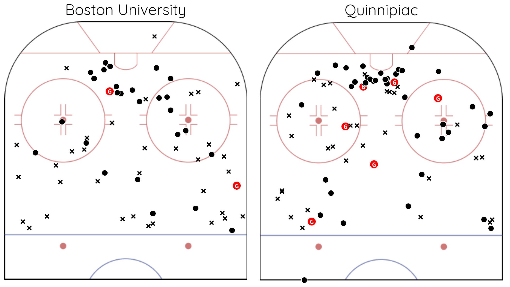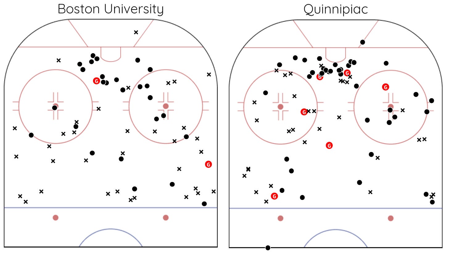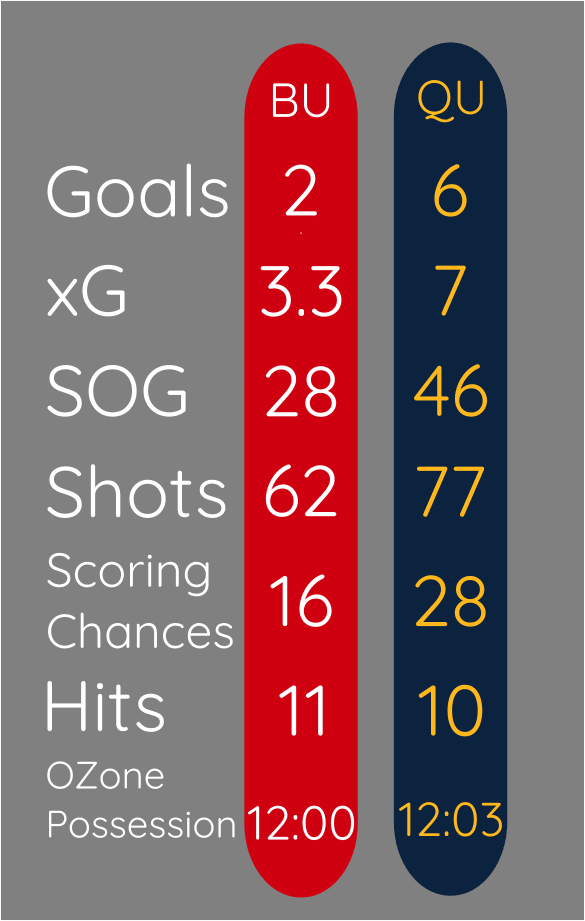 Quinnipiac recorded 12 high danger shots (3.16 xG) compared to BU’s 4 (.86 xG). All 4 of BU’s shots were saved, while Yegorov saved 8 of QU’s high danger shots (2.27 xG) with only 1 resulting in a goal.