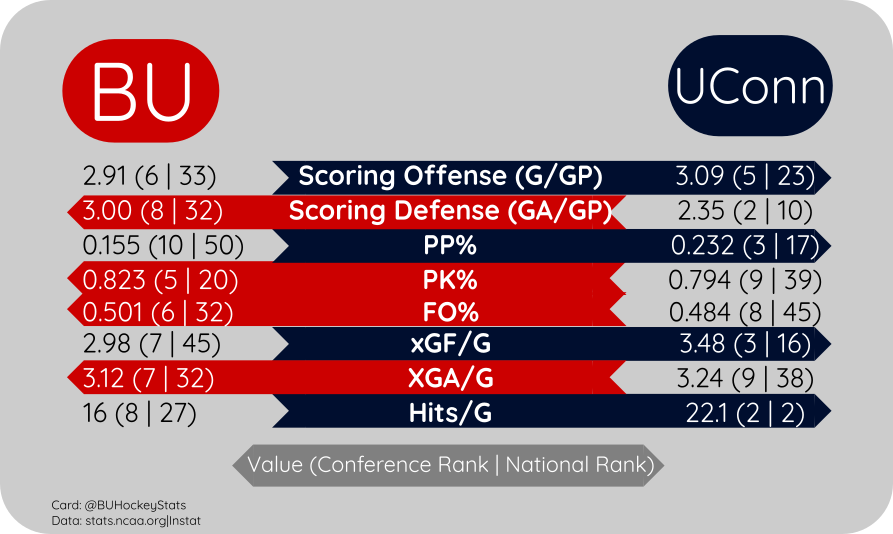 In a rematch of the 2025 Hockey East Tournament Semifinal, BU faces off with UConn for a spot at the Garden. The teams split the season series with each team winning on the road (4-8, 3-1).