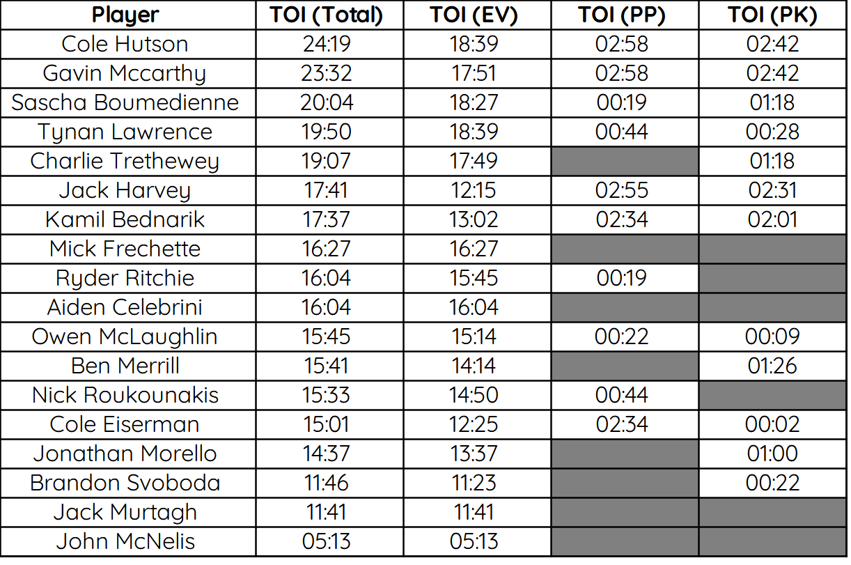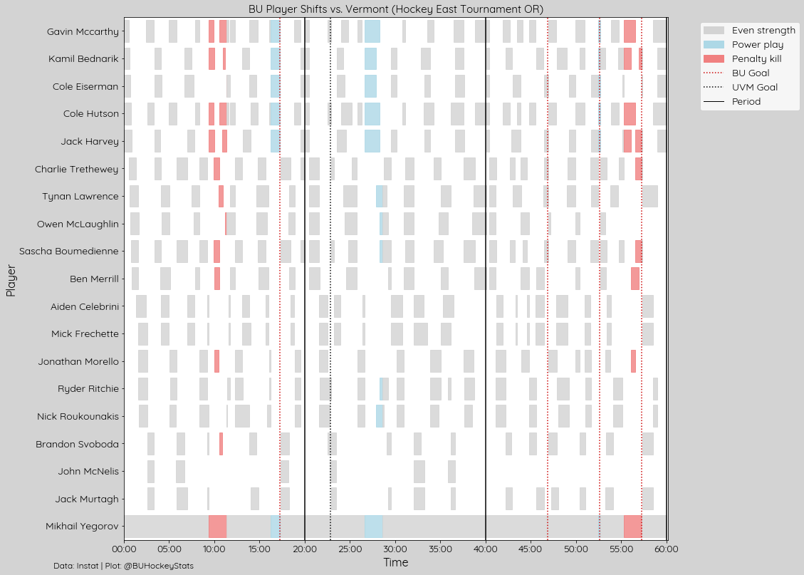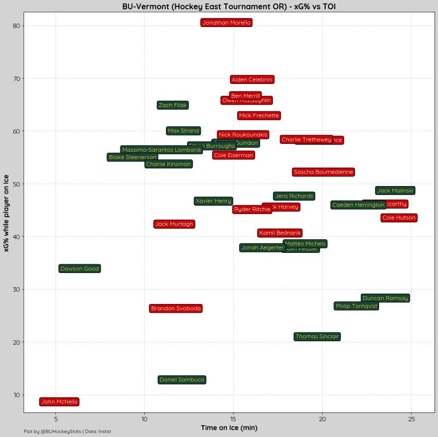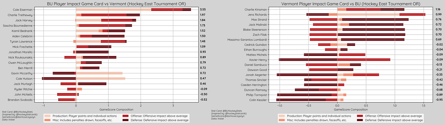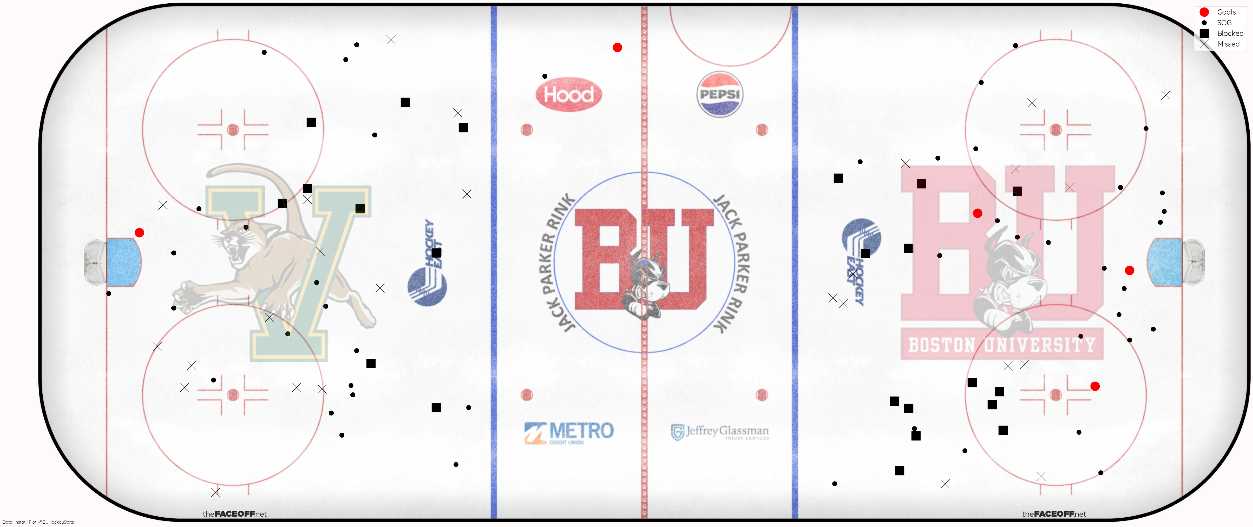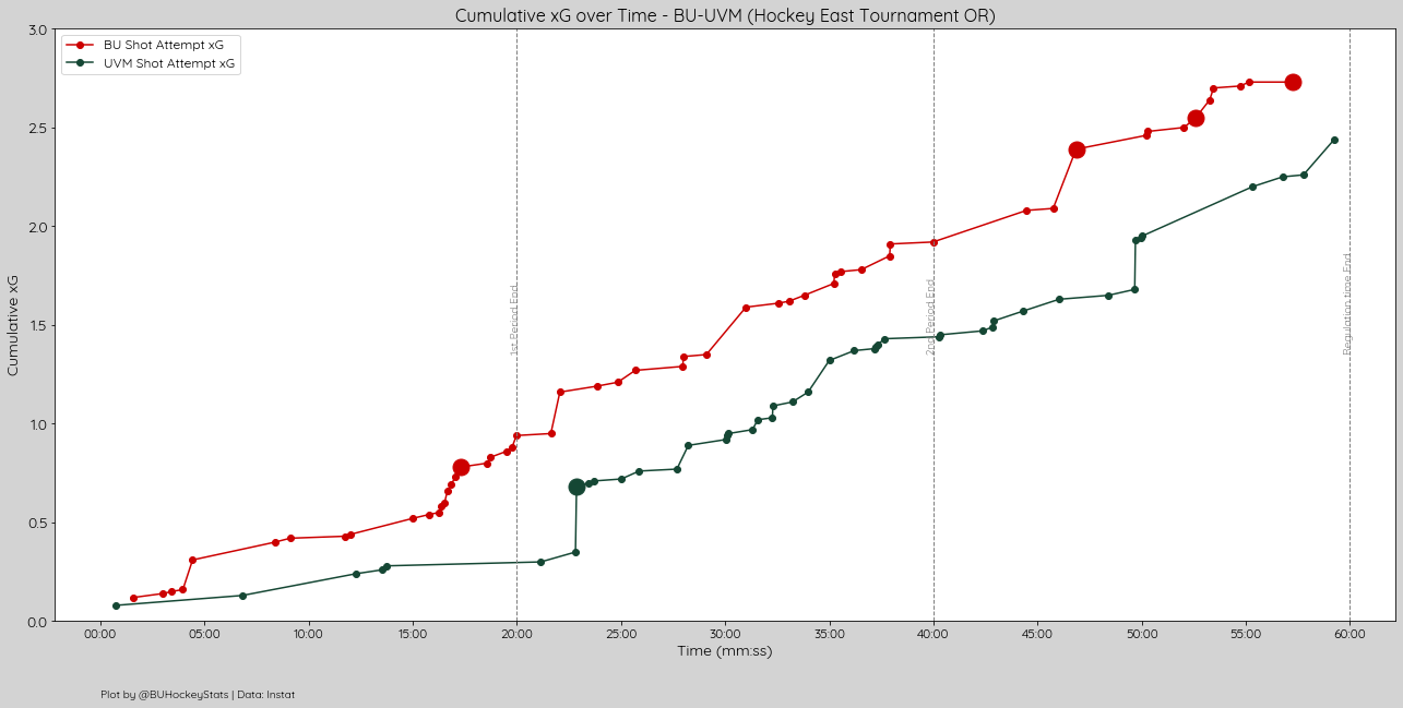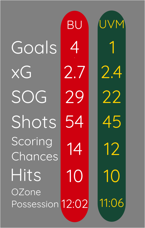 Both teams recorded 3 high danger shots, for BU (.75 xG) two were saved and the other resulted in Cole Eiserman’s 2nd goal (.30 xG), while UVM (.83 xG) had one result in a goal, one saved and one miss the net.