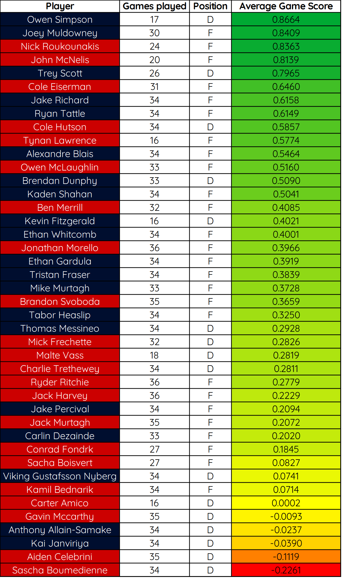 10 of 18 Terriers recorded xG% over 50, led by Jonathan Morello at 80.53.