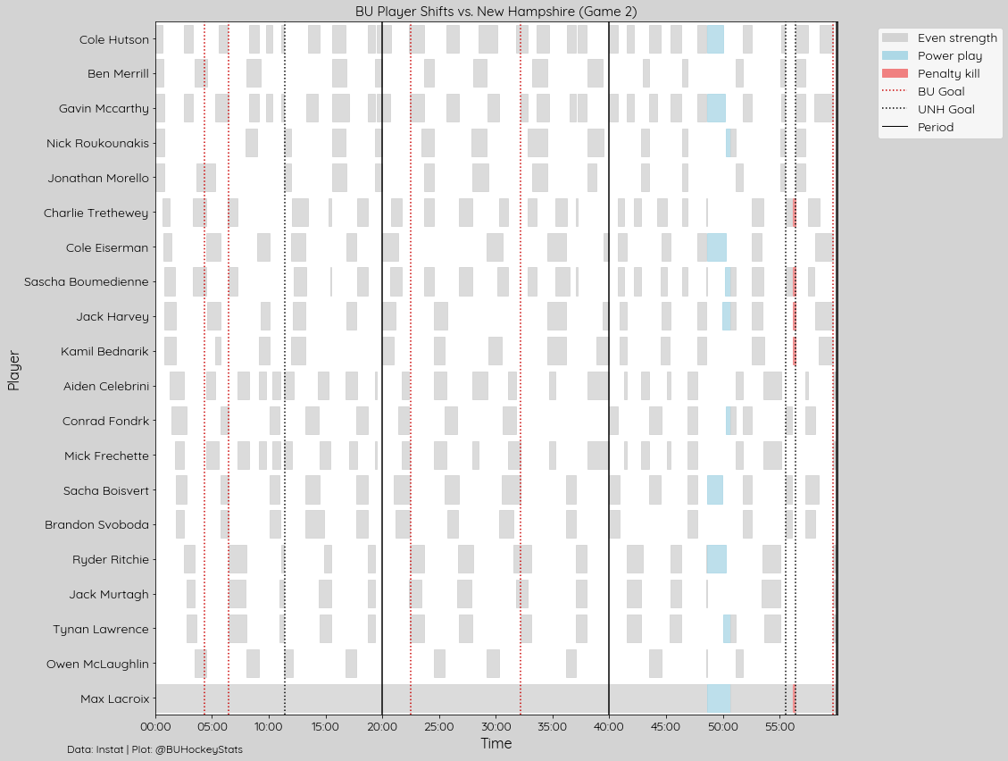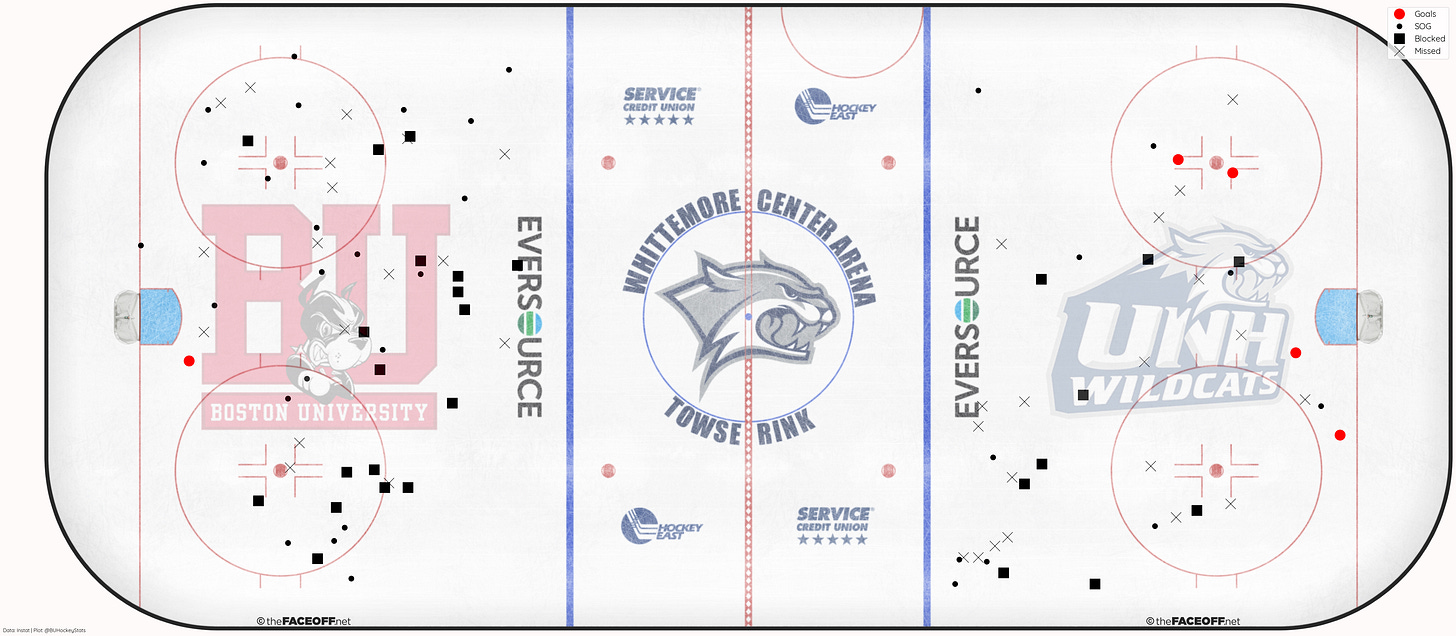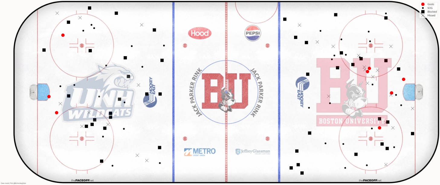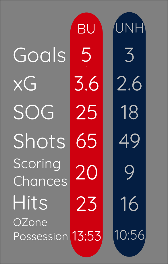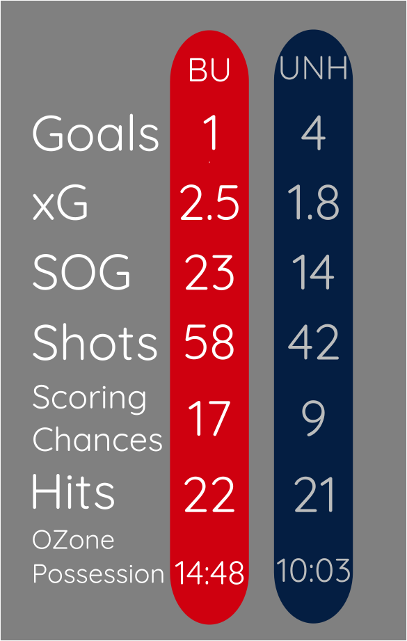 BU recorded 2 High Danger shots (.46 xG), one missed the net, one was saved. UNH recorded 1 (.25 xG) which resulted in a goal.