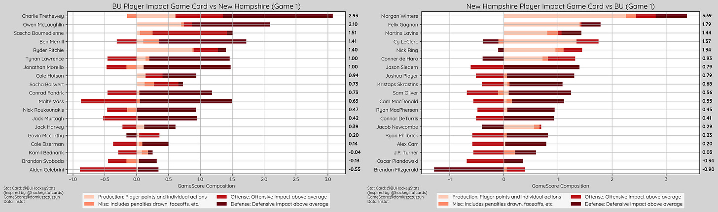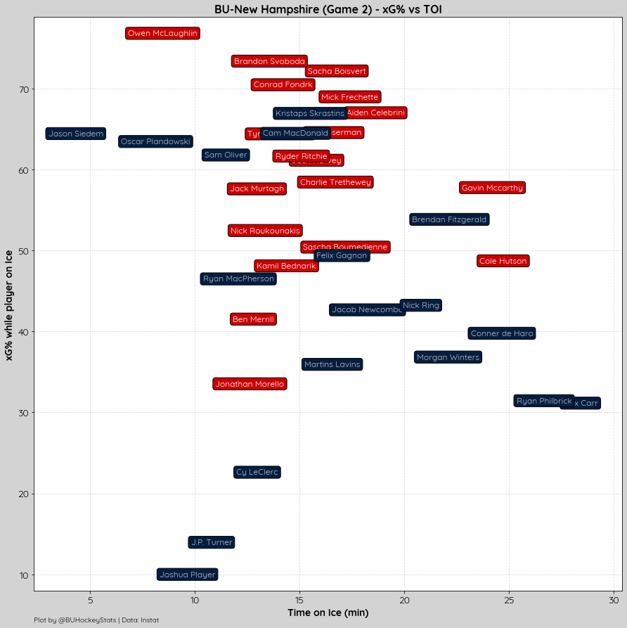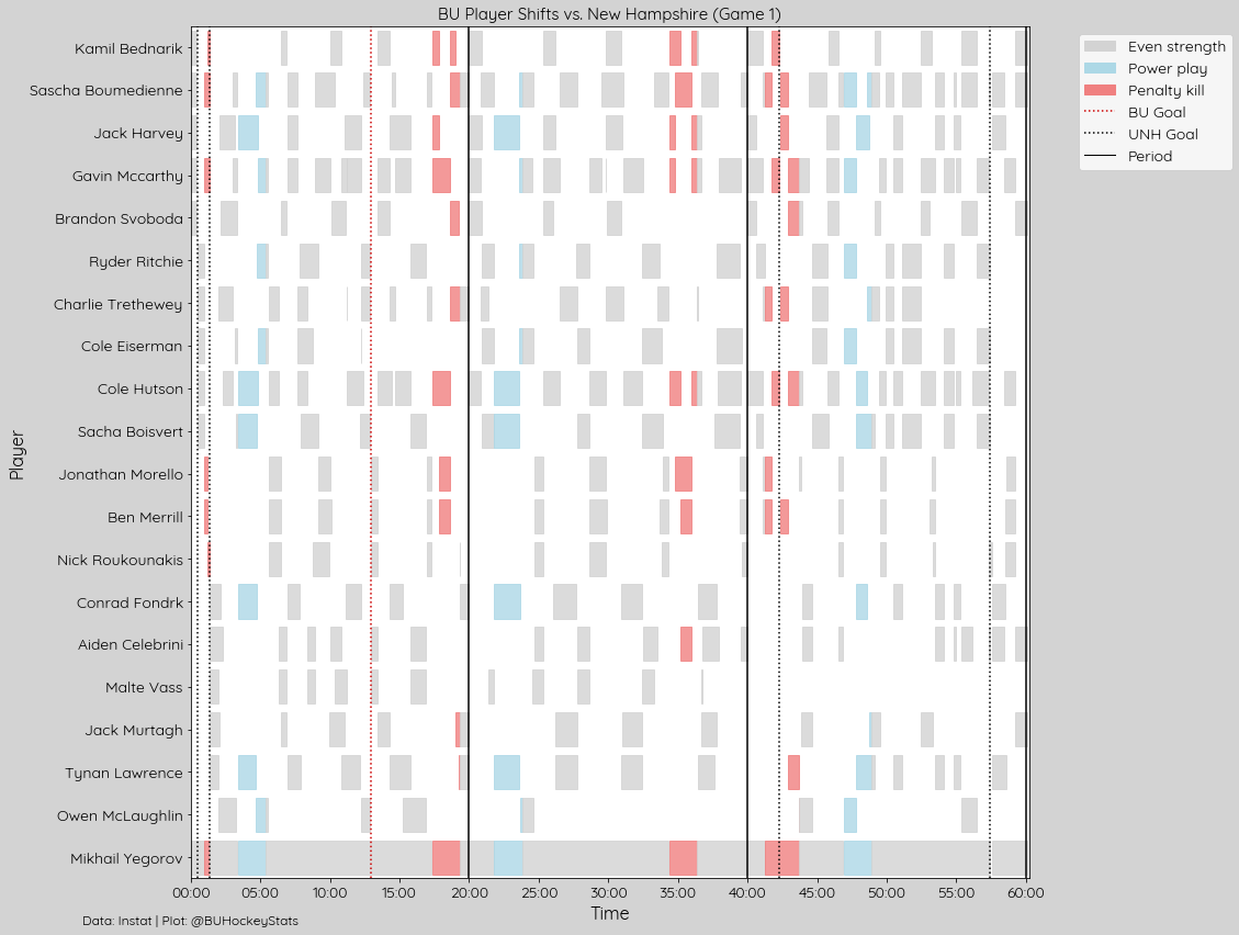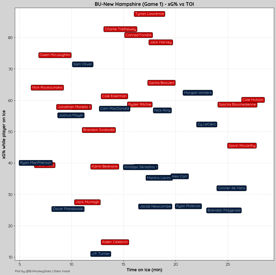 BU recorded 4 High Danger shots (1.09 xG) three of which occurred in the first period including Svoboda’s goal (.25xG). UNH recorded just 2 (.59 xG) with 1 resulting in a third period goal.