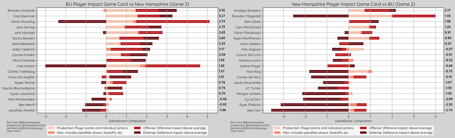 Brandon Svoboda was the team’s top performer for the second time this week (Beanpot Final vs. BC) and matches Jack Harvey with 4 top games for the Terriers both are just 1 behind Cole Eiserman for the team lead. In terms of Game Score this was Svoboda’s 3rd best game of his career behind Maine on Nov 1st (5.38) and Northeastern on December 13th.
